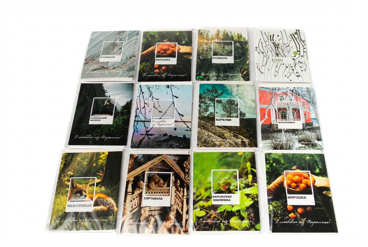 - Дизайн: символы Карелии (ягоды, животные, петроглифы, пейзажи, в ассортименте);