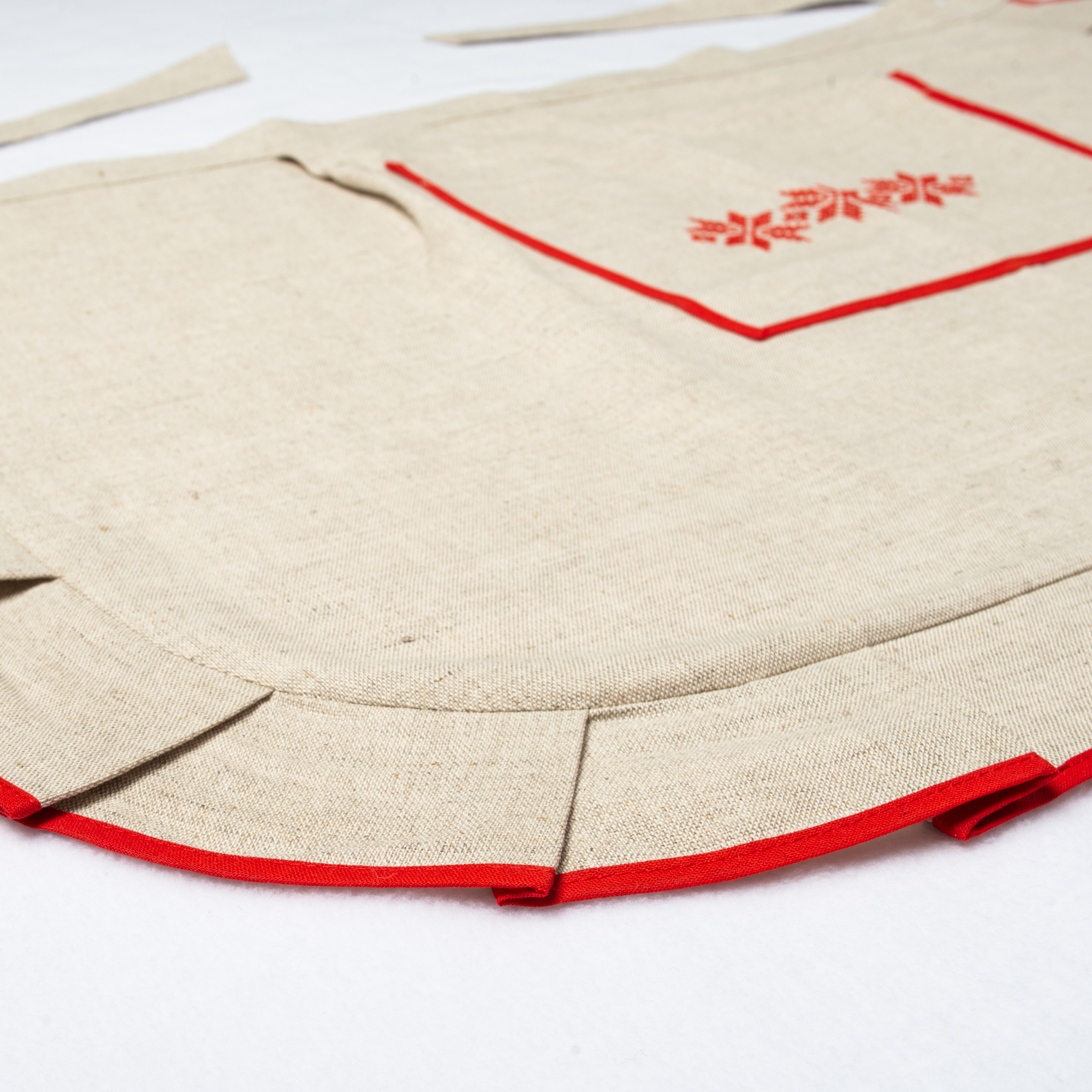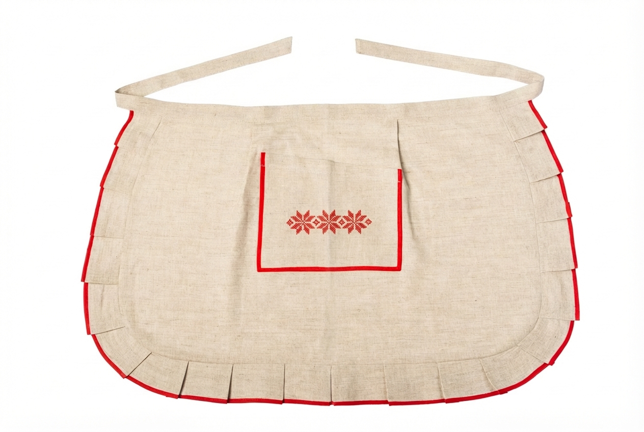 Аккуратный поясной фартук из натурального льна - красивый и практичный аксессуар для кухни и сервировки в северном стиле. Светлая льняная ткань смотрится благородно и «по‑домашнему», а контрастная красная окантовка и декоративные складки по краю придают фартуку нарядный вид. Спереди расположен удобный накладной карман с вышивкой традиционного орнамента для мелочей, которые всегда должны быть под рукой. Лён прочный и долговечный, хорошо переносит ежедневное использование и со временем становится мягче.