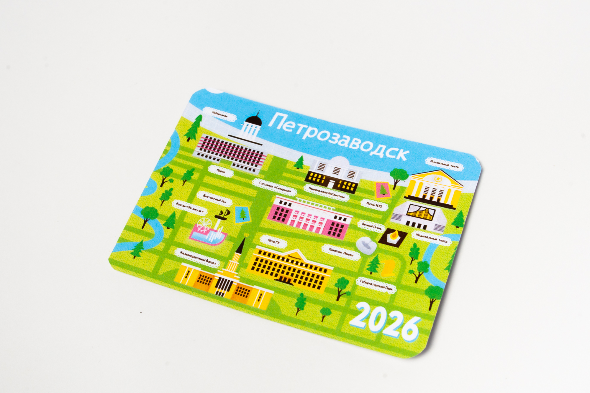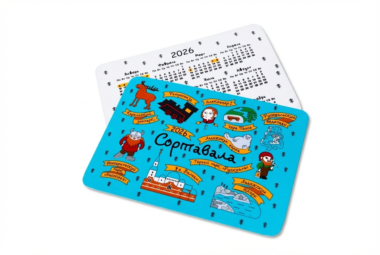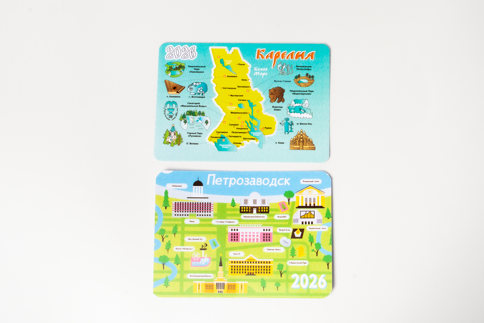 Яркие карманные календари с иллюстрированными картами Карелии, Петрозаводска и Сортавалы - маленький, но очень полезный сувенир на каждый день. На лицевой стороне изображены дружелюбные рисунки с основными достопримечательностями: озёра, заповедники, храмы, набережные, ретропоезд, водопады и другие знаковые места. На обороте - удобная календарная сетка на весь 2026 год, чтобы нужные даты всегда были под рукой. Календари легко помещаются в кошелёк, обложку для документов или ежедневник и становятся приятным напоминанием о путешествии по Карелии.