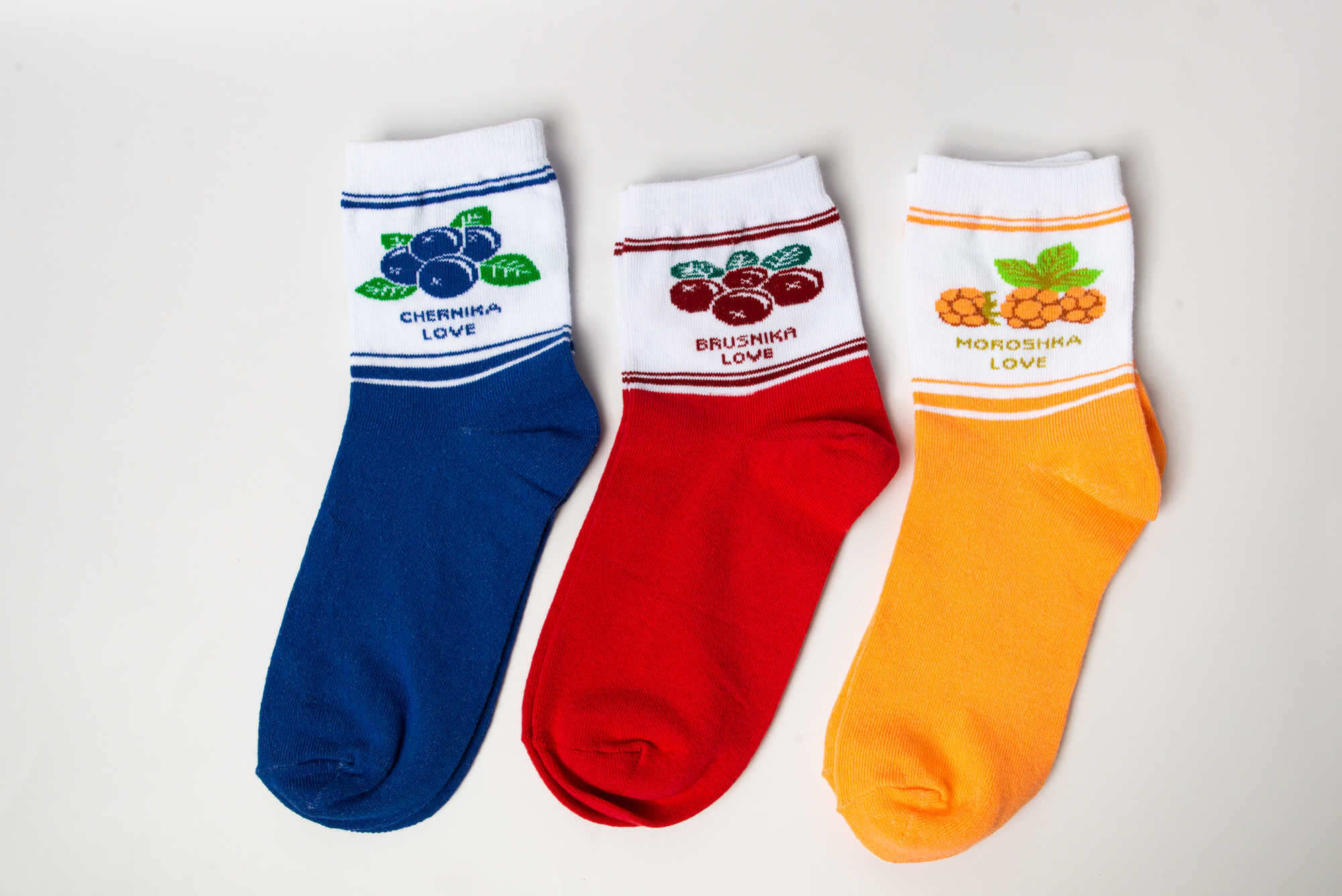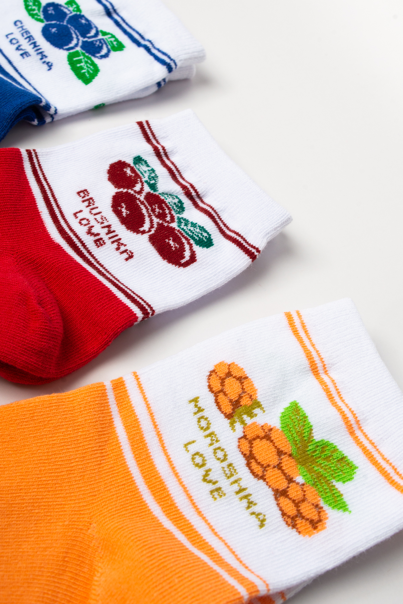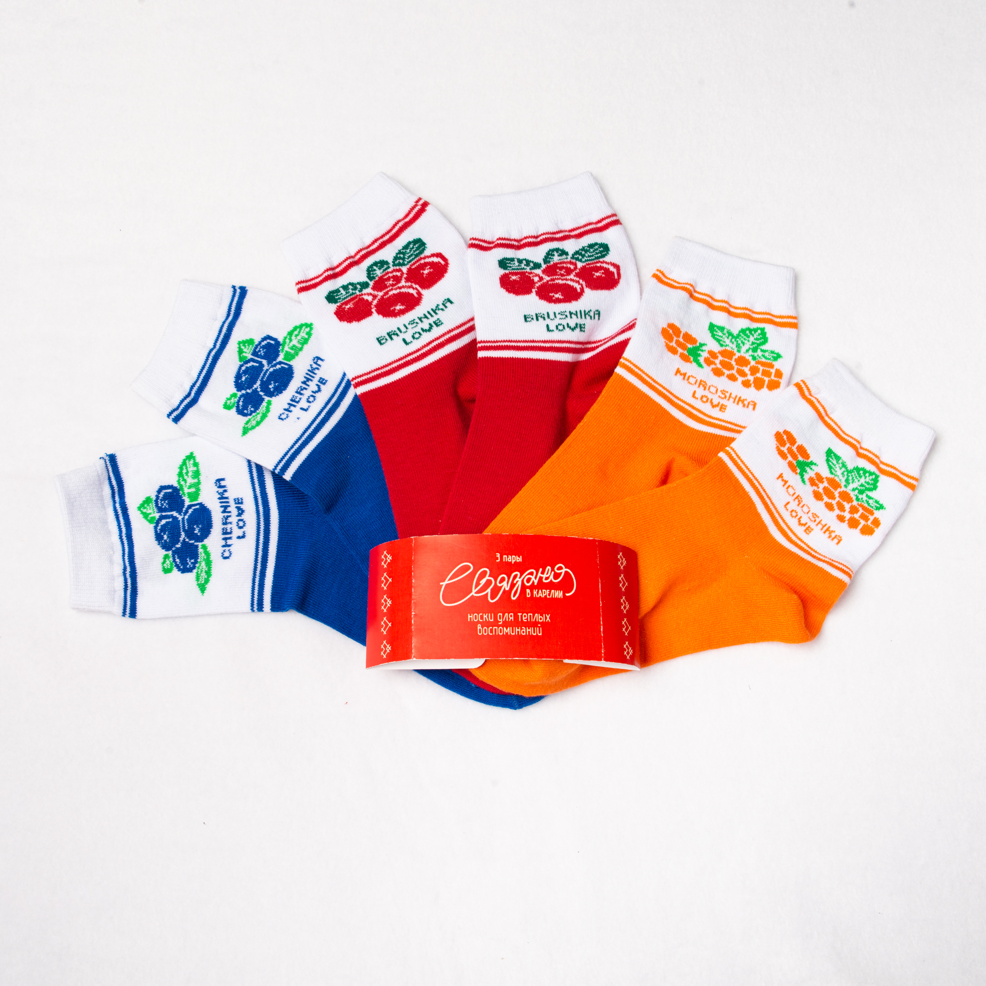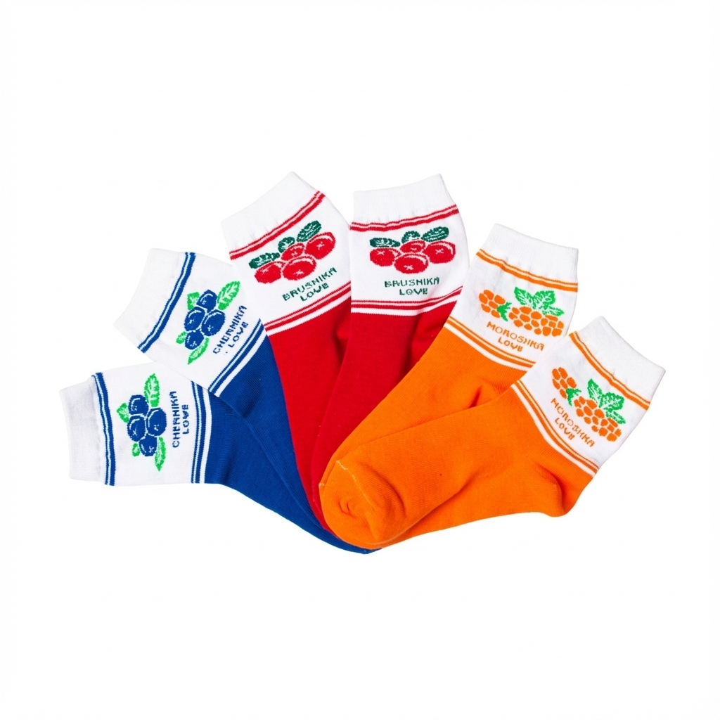 Яркий сувенирный набор из трёх пар носков с любимыми северными ягодами: черника, брусника и морошка. Белая верхняя часть с рисунком и надписью LOVE выглядит свежо и аккуратно, а цветная стопа (синий/красный/оранжевый) добавляет настроения и делает каждую пару узнаваемой.