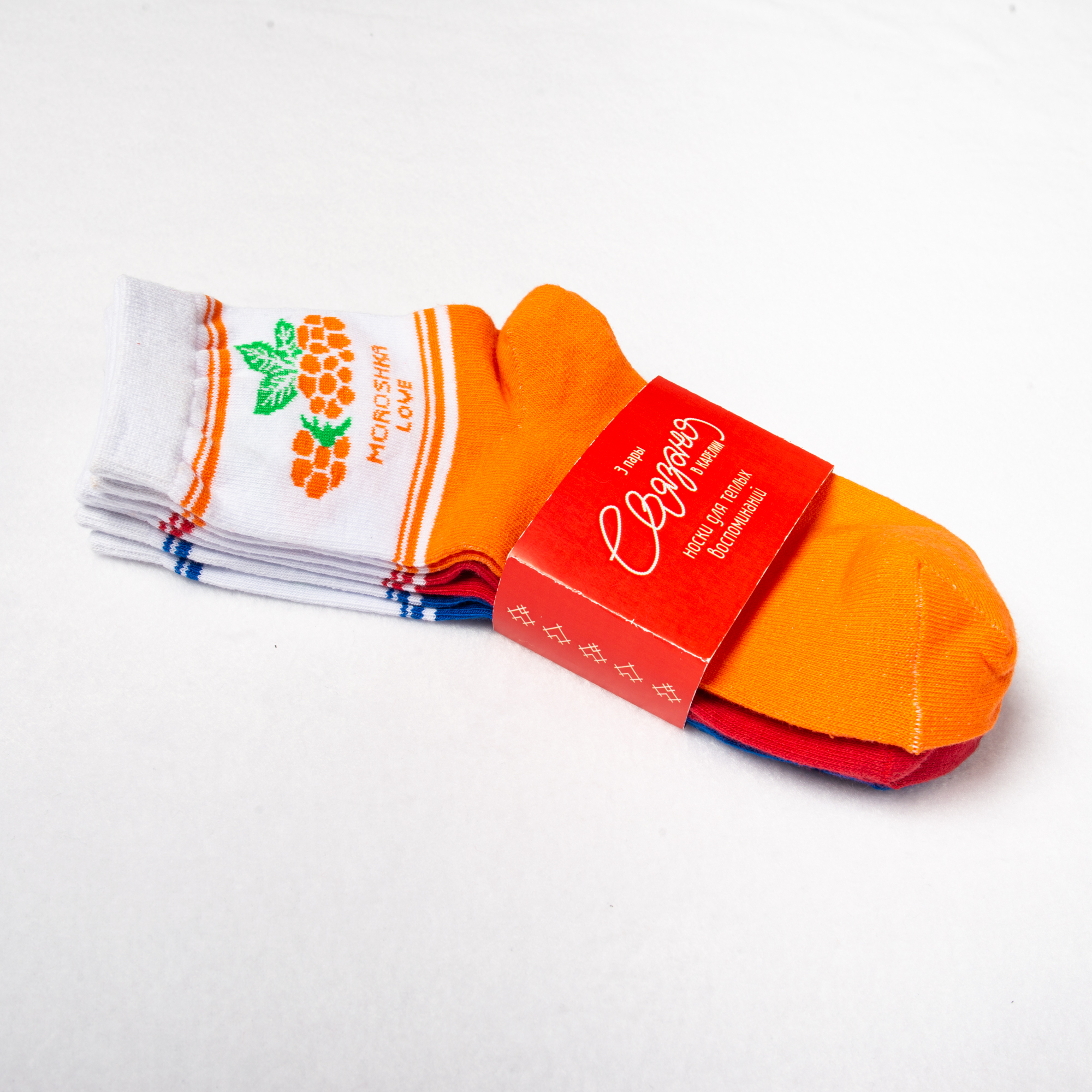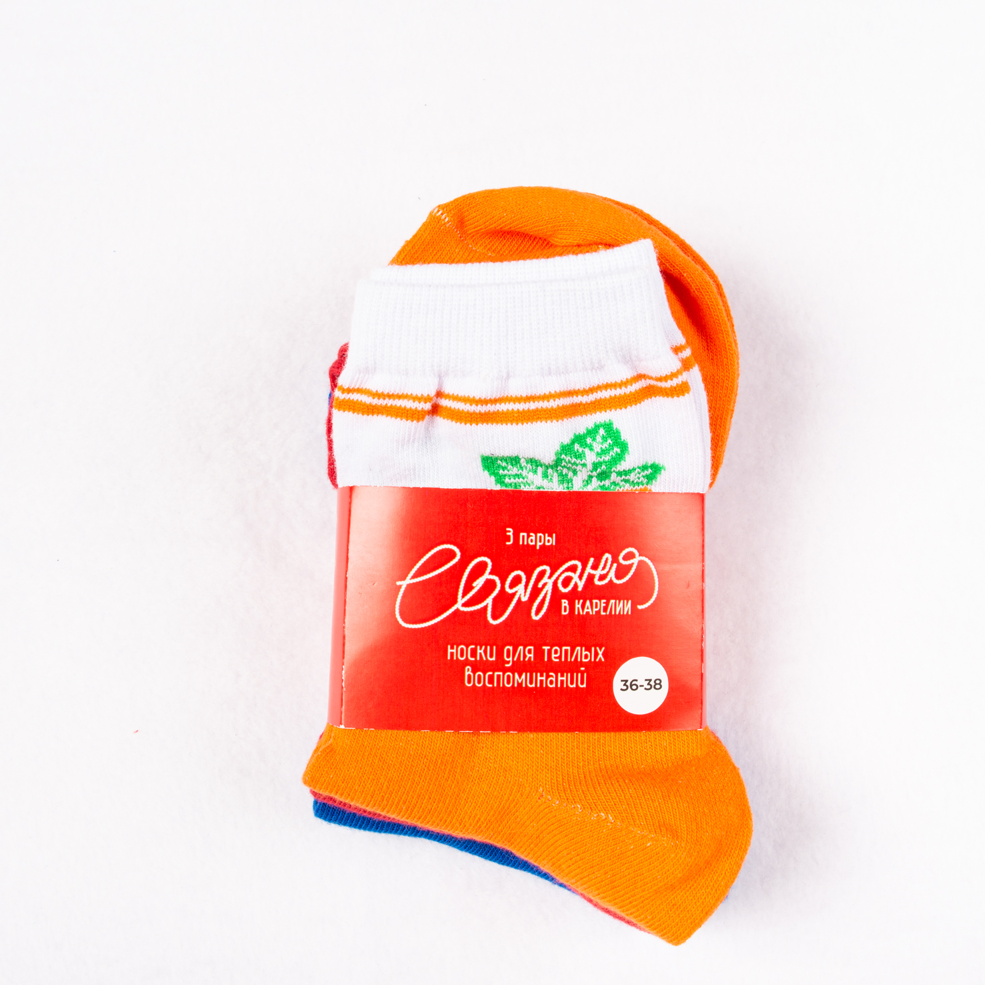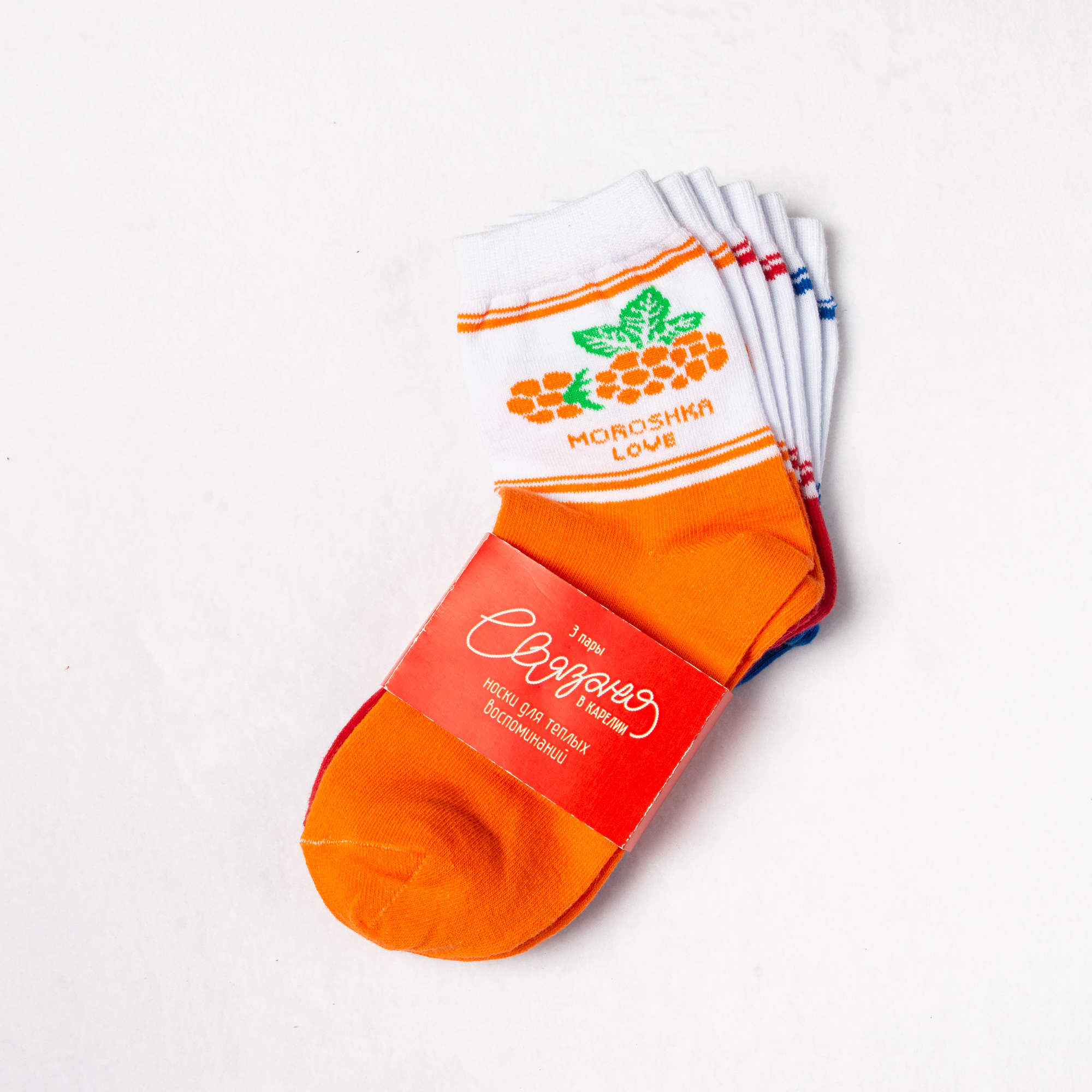 Яркий сувенирный набор из трёх пар носков с любимыми северными ягодами: черника, брусника и морошка. Белая верхняя часть с рисунком и надписью LOVE выглядит свежо и аккуратно, а цветная стопа (синий/красный/оранжевый) добавляет настроения и делает каждую пару узнаваемой.