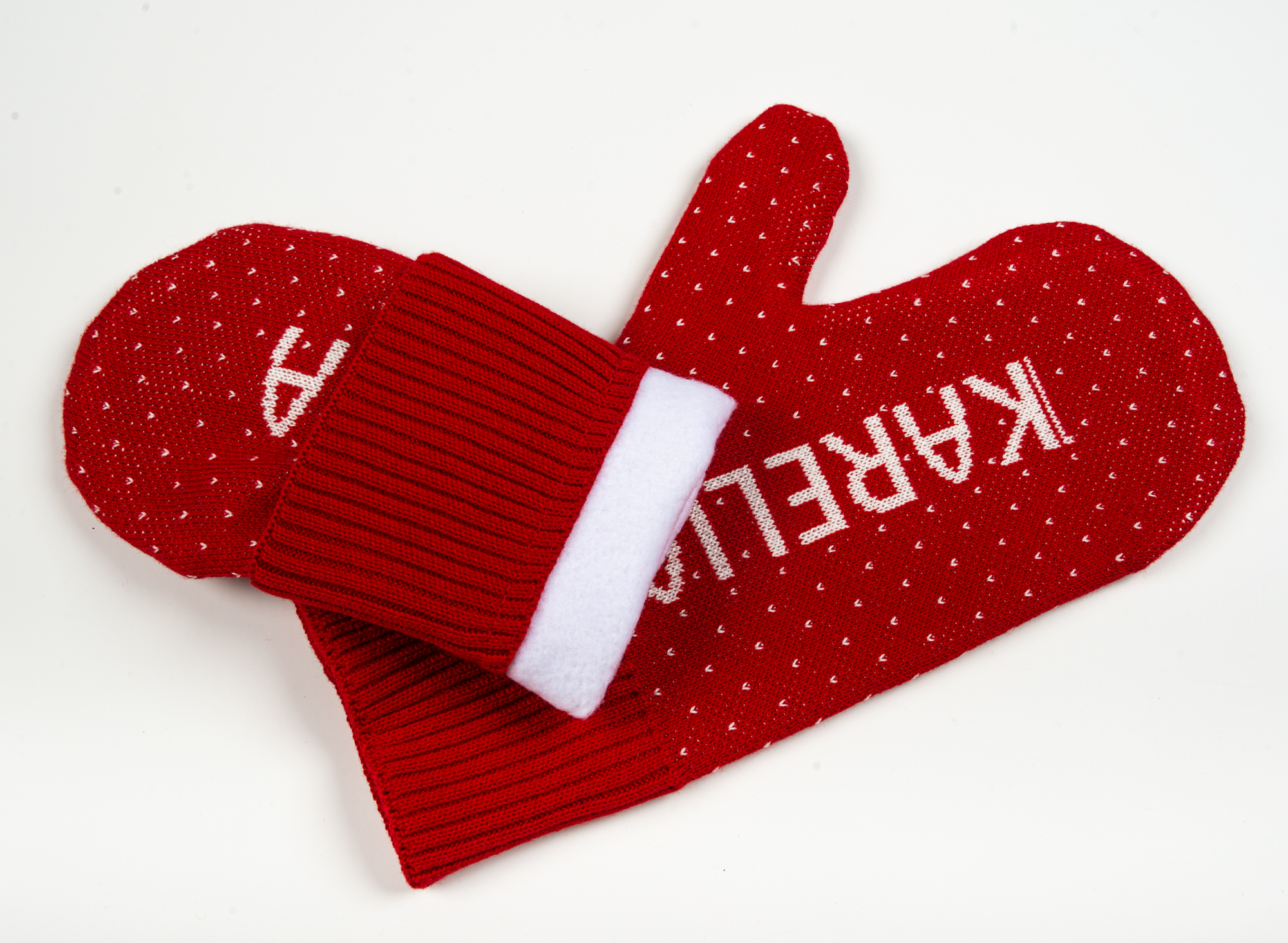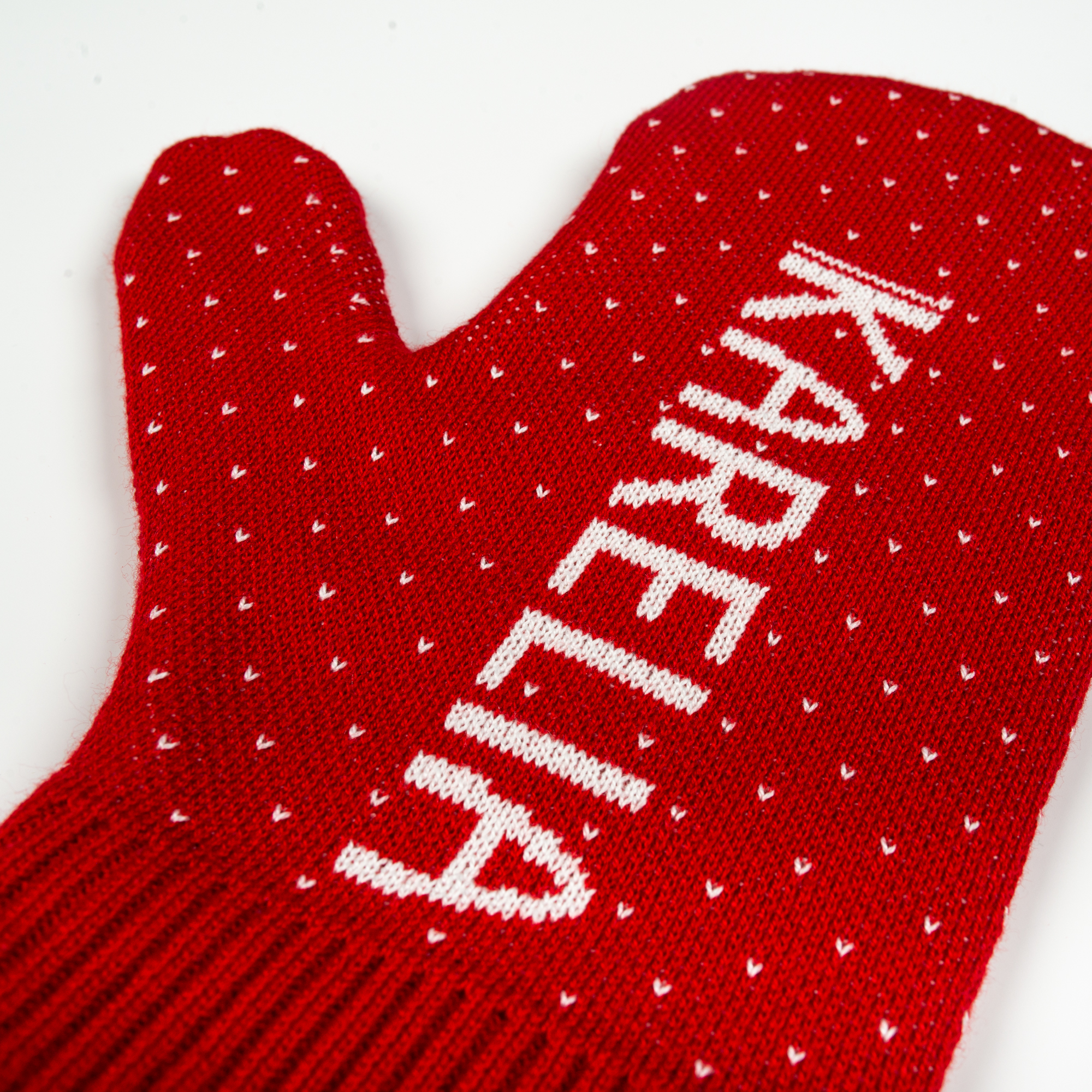 Яркие вязаные двухслойные варежки с надписью KARELIA - тёплый сувенир и стильный зимний аксессуар с северным настроением. Насыщенный красный цвет и мелкий белый узор создают ощущение «праздничной зимы», а контрастная надпись делает дизайн лаконичным и узнаваемым. Плотная вязка хорошо удерживает тепло, а широкая манжета‑резинка плотно сидит на запястье и защищает от ветра - удобно для прогулок и поездок.