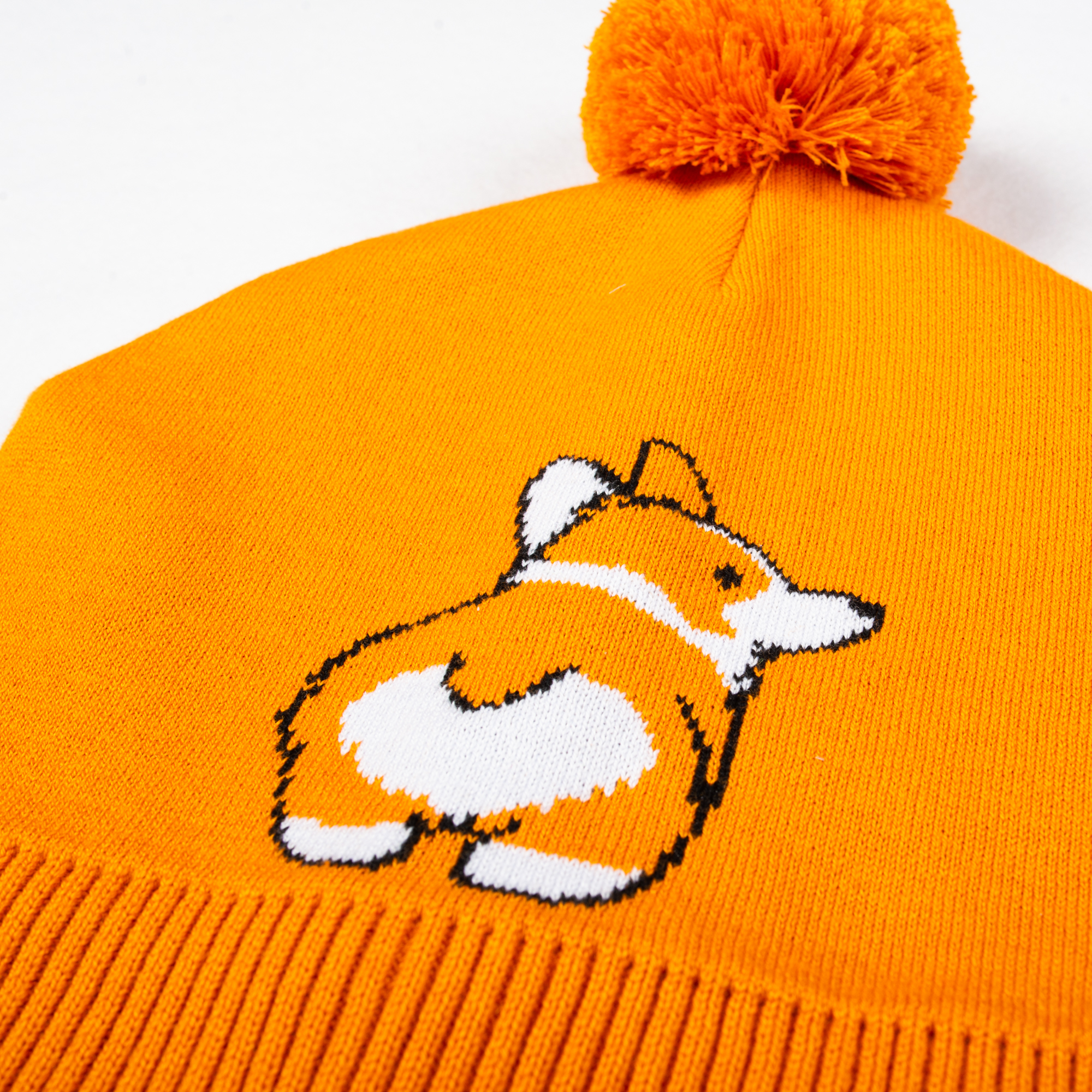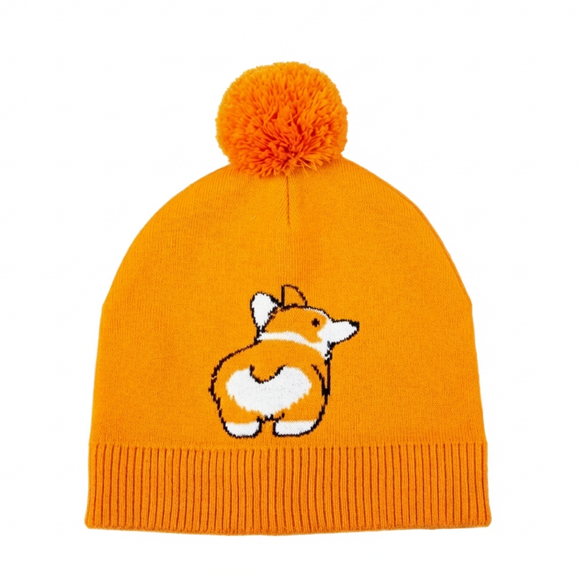 - Тип: вязаная шапка с помпоном и жаккардовым рисунком корги;
