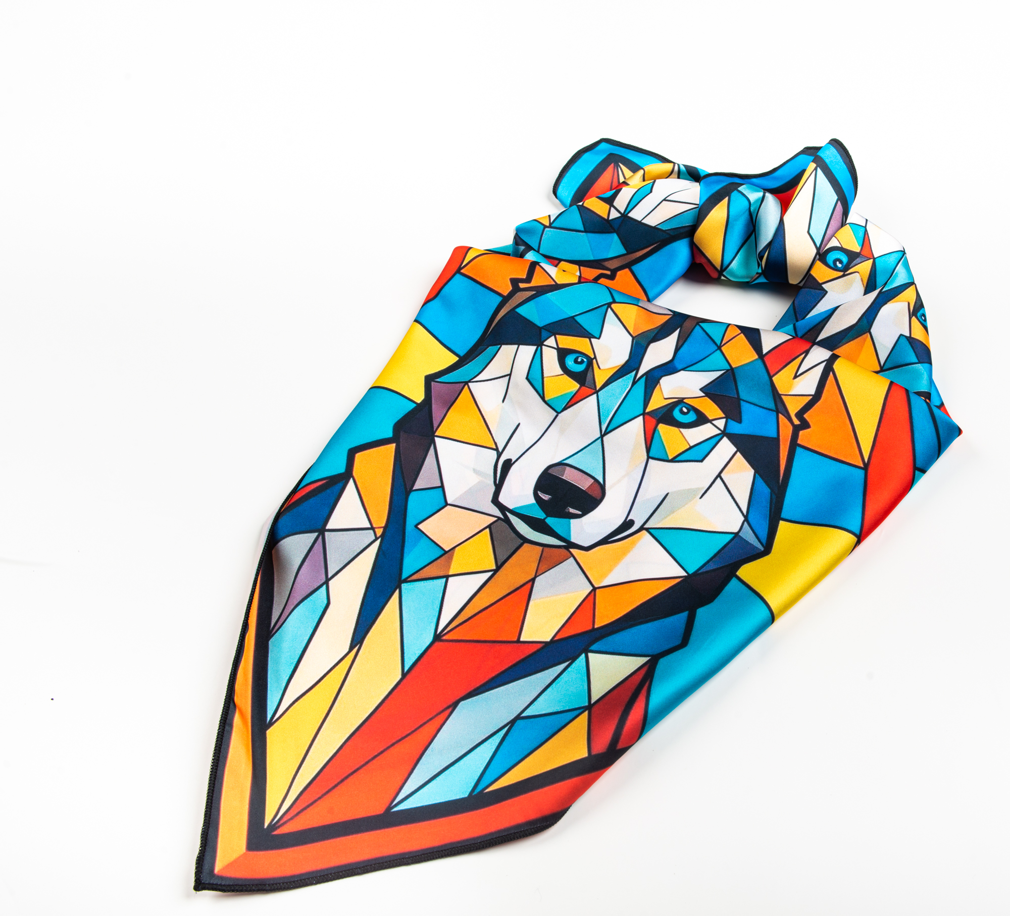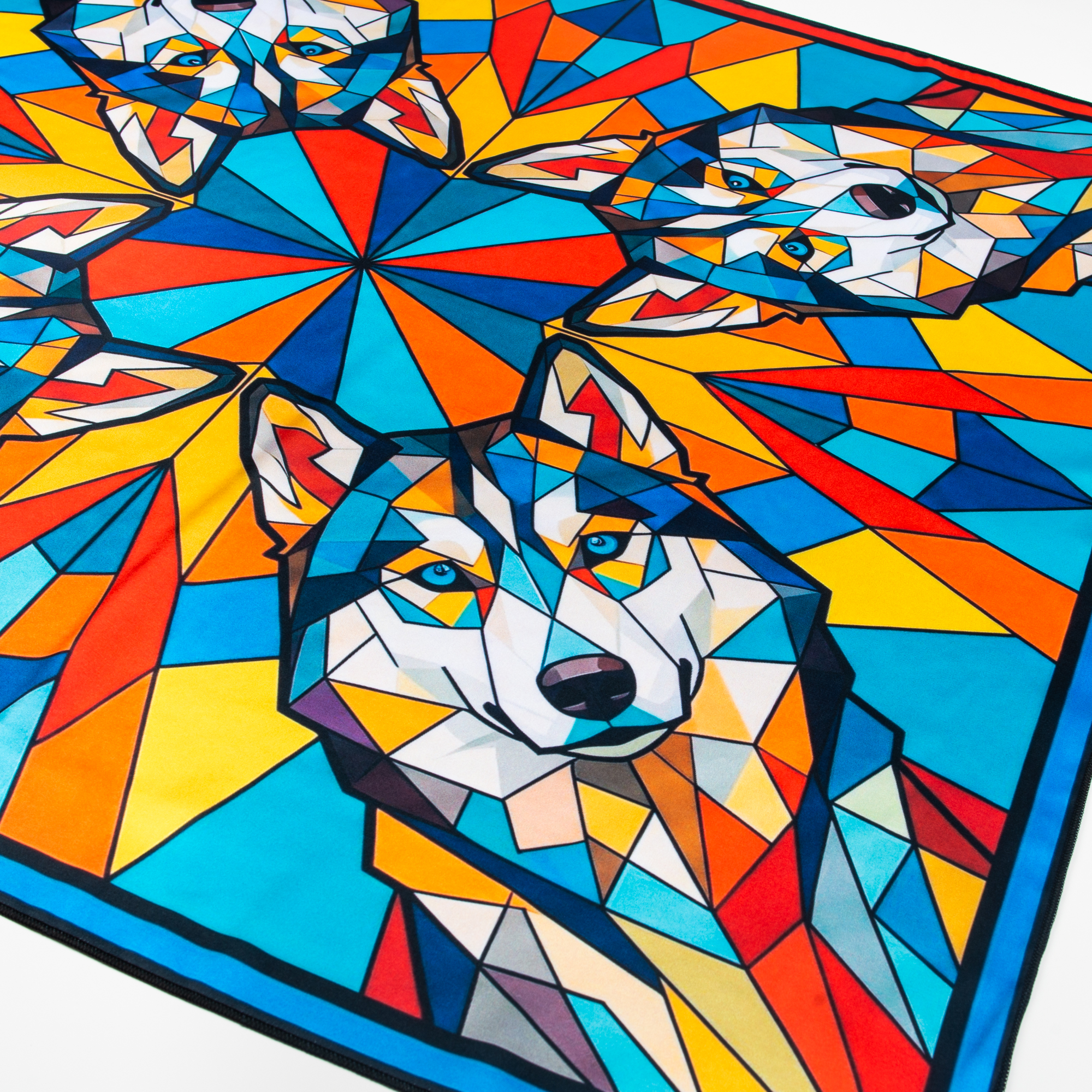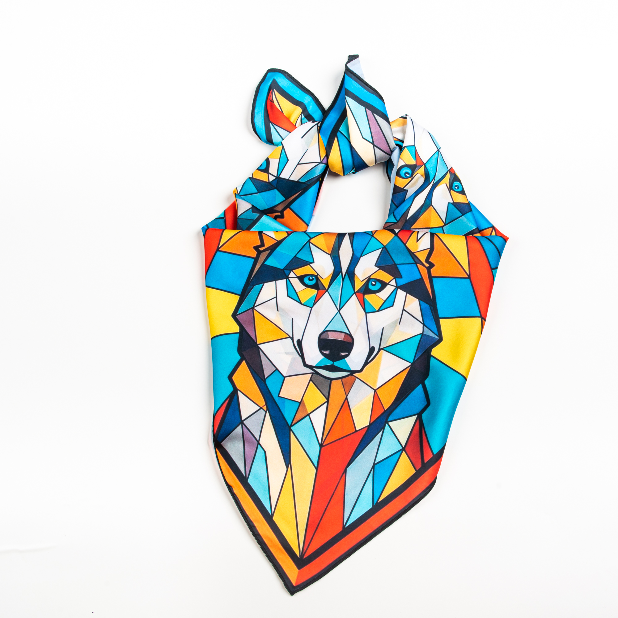 Шейный платок «Хаски. Витраж» - смелый акцентный аксессуар с северным характером и эффектом “арт‑объекта”. Дизайн построен как витражная мозаика: четыре портрета хаски складываются в симметричный калейдоскоп, а яркие геометрические лучи создают ощущение движения и света. Палитра сочная и контрастная: бирюза, синий, красный, оранжевый и жёлтый, поэтому платок моментально оживляет базовые образы и делает стиль собранным без лишних усилий.