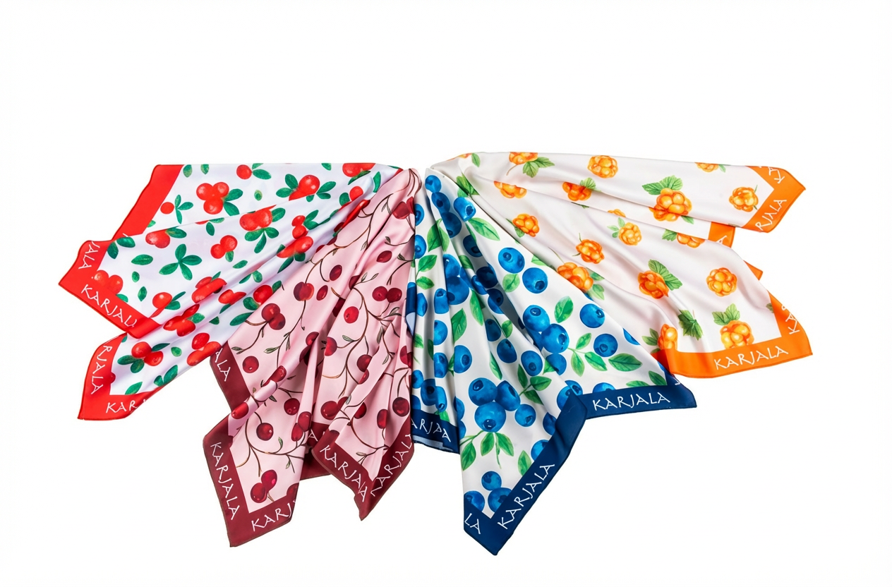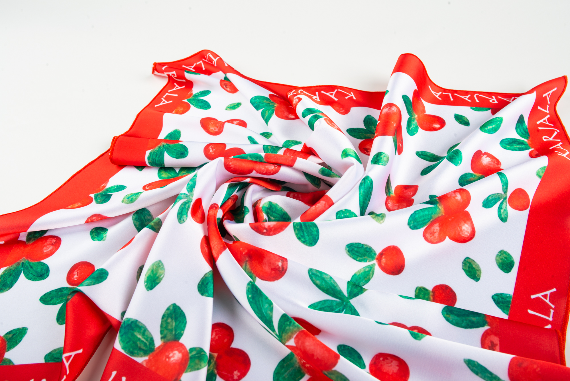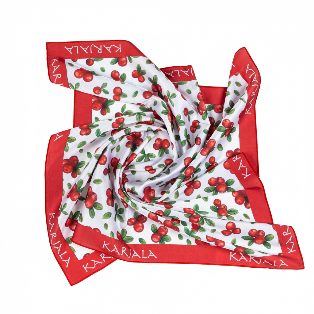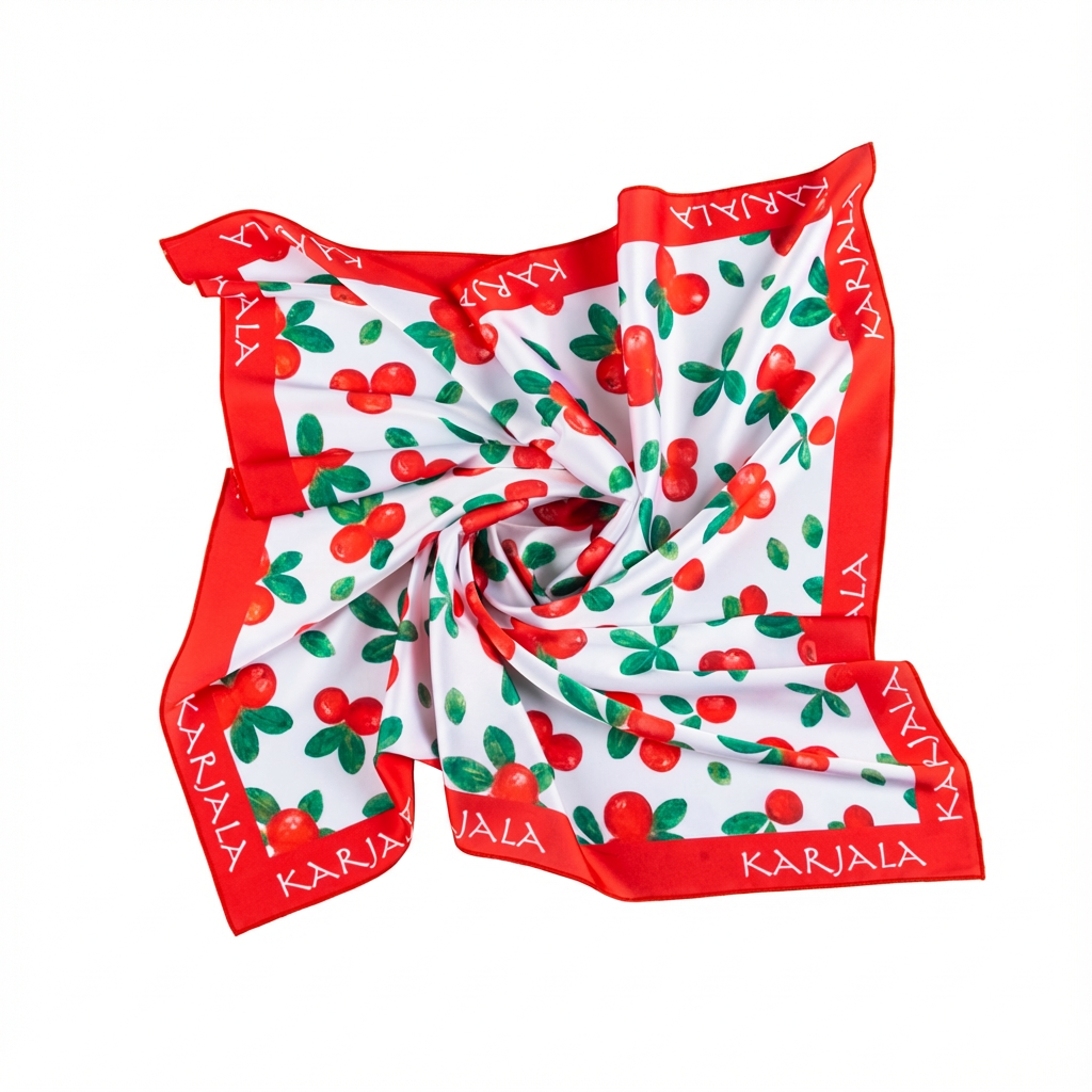 Лёгкий платок из "шелка Armani" с ярким принтом, вдохновлённым карельским лесом: россыпь спелой брусники и свежая зелень на белом фоне - как ягодные поляны ранней осенью, когда воздух теплый и пахнет хвоей и мхом. Яркая красная рамка с надписью KARJALA делает платок выразительным акцентом и подчёркивает его северный, сувенирный характер. Платок красиво драпируется, мягко ложится на шею и добавляет образу сочный «лесной» штрих, словно вы привезли с собой кусочек карельской природы.