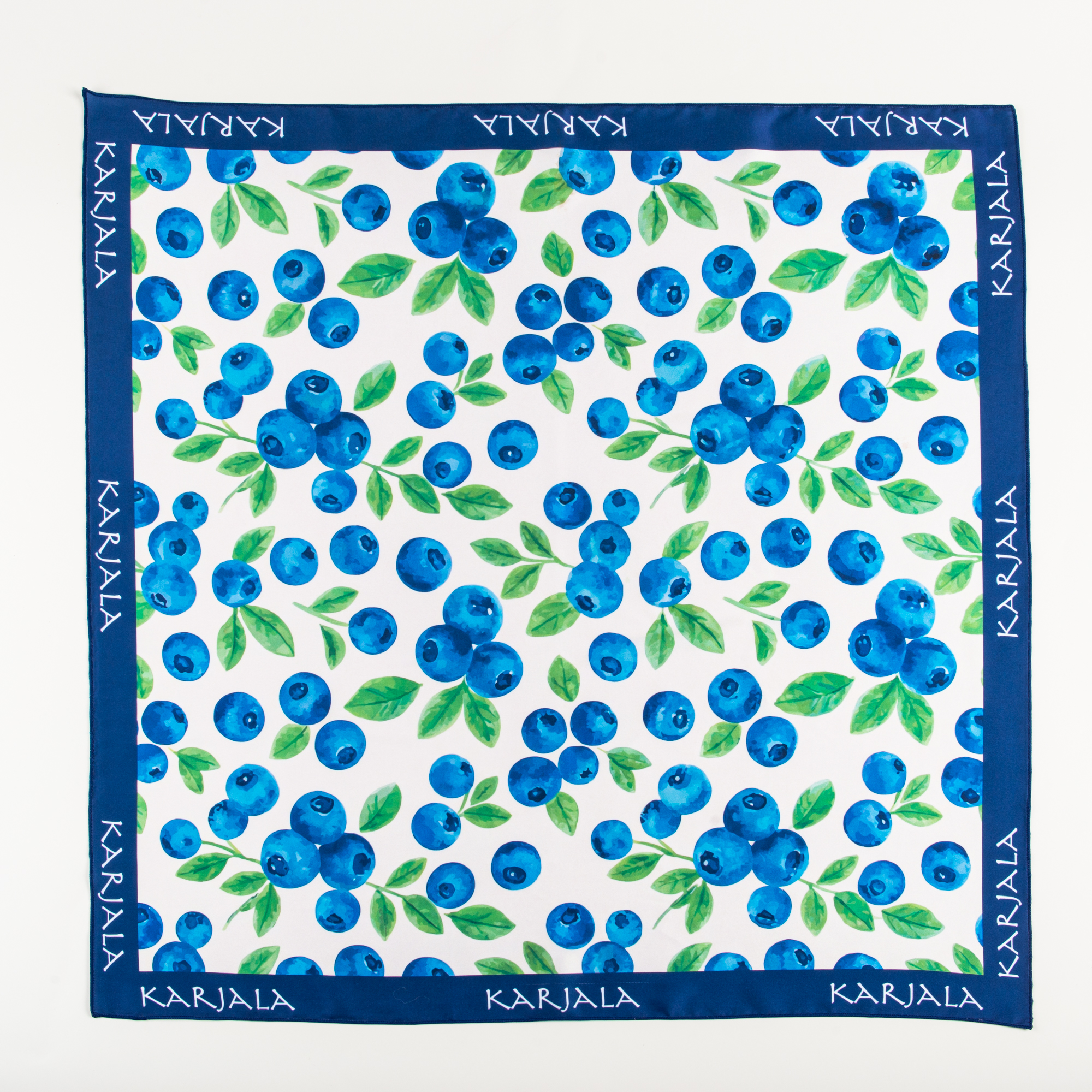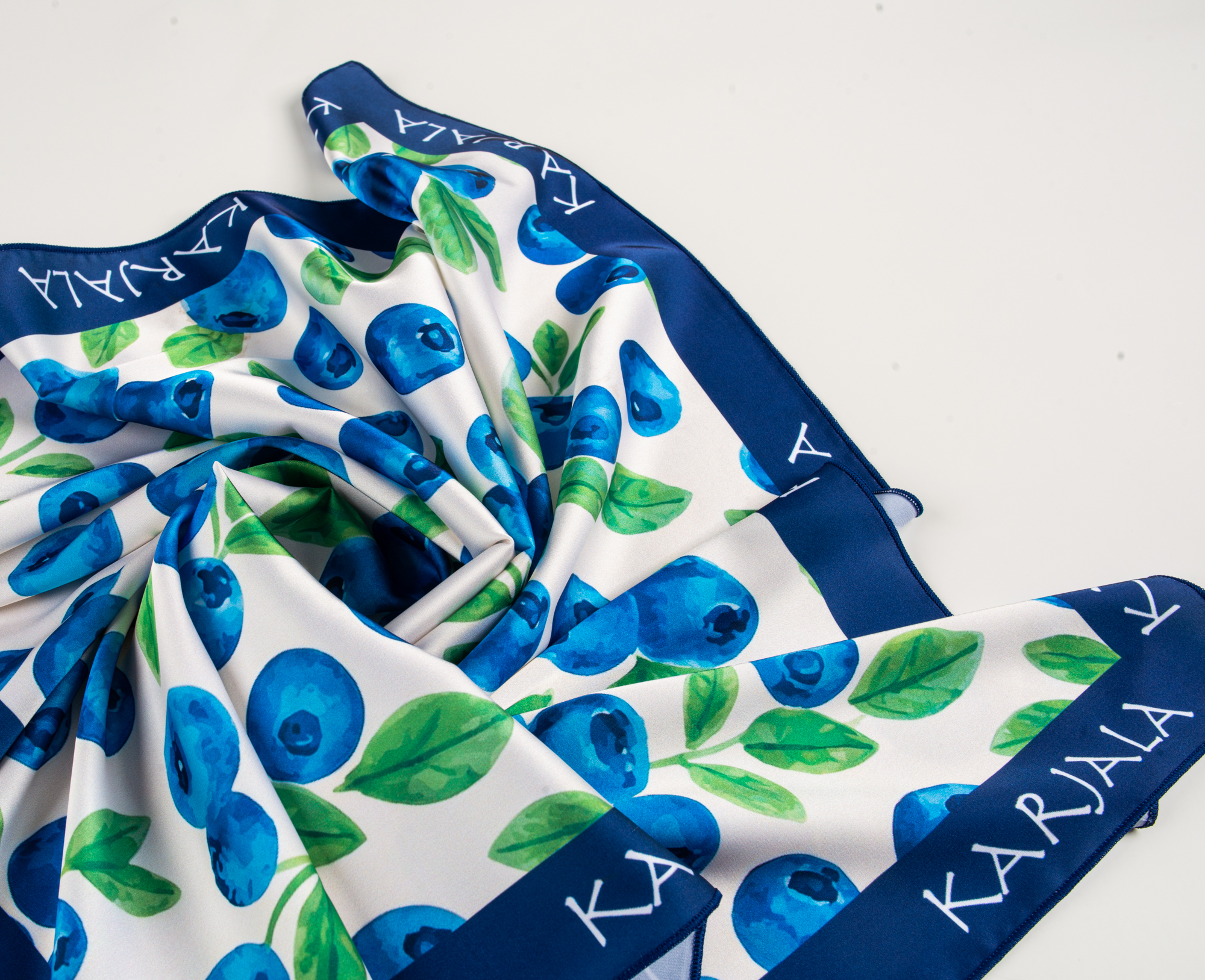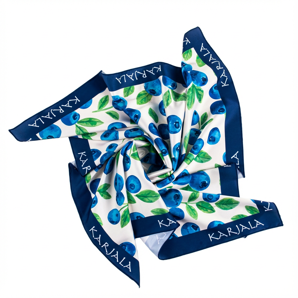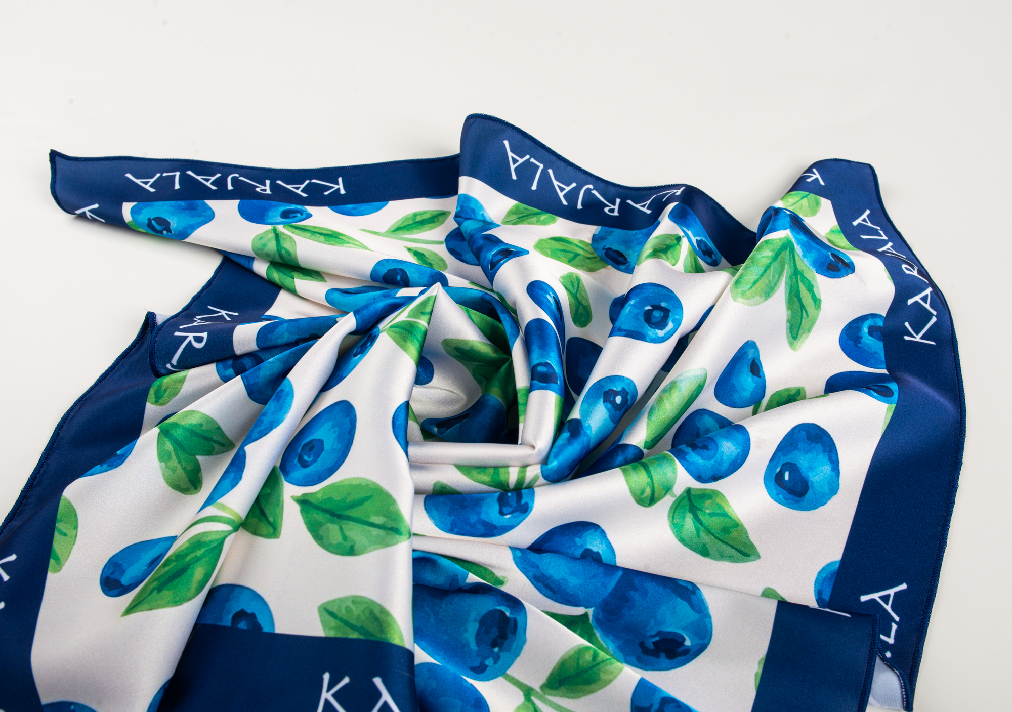 Лёгкий платок из "шелка Armani" с ягодным принтом, вдохновлённым карельским лесом: россыпи спелой черники и свежие зелёные листочки на светлом фоне, как после тихой прогулки по мшистым тропам. Глубокая синяя кайма с надписью KARJALA подчёркивает сувенирность и делает платок выразительным акцентом в образе. Платок красиво драпируется, мягко ложится на шею и добавляет ощущение свежести и «лесного» настроения, будто кусочек карельского лета всегда рядом.