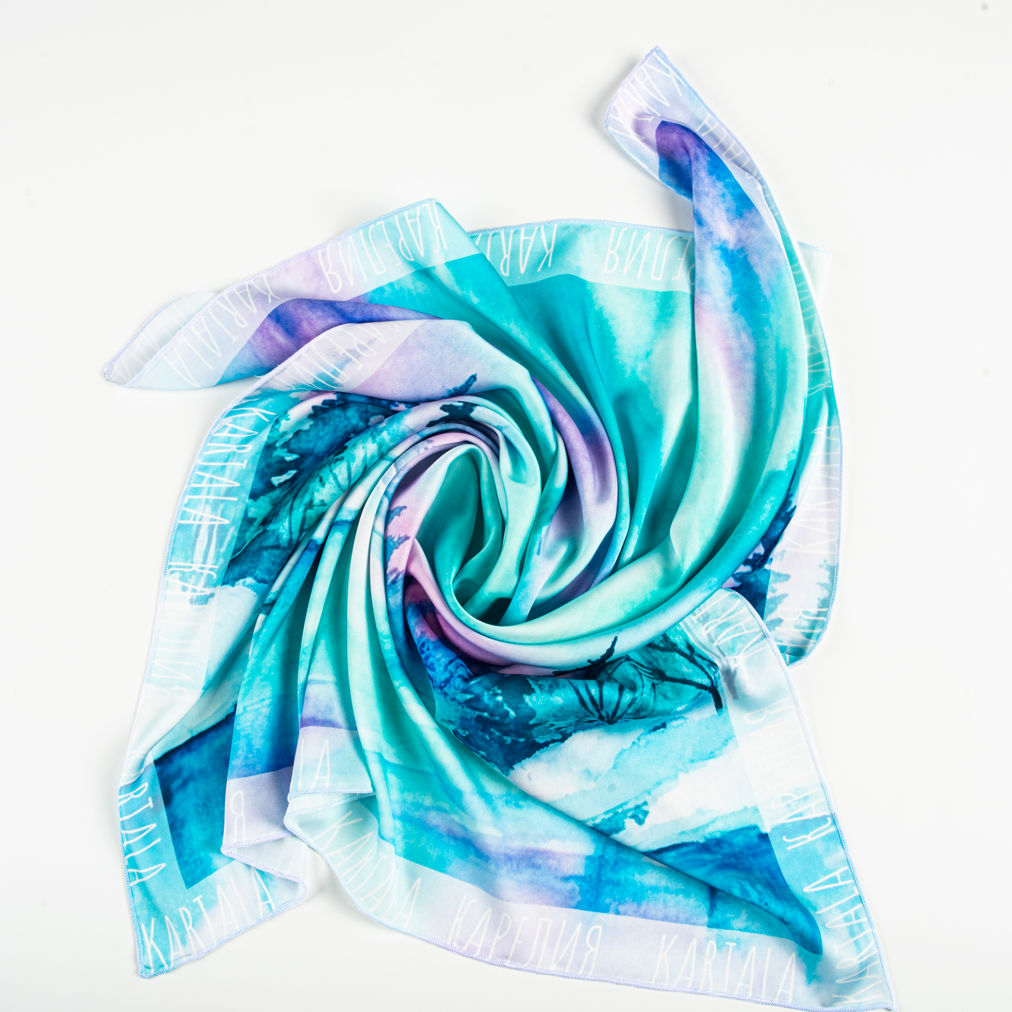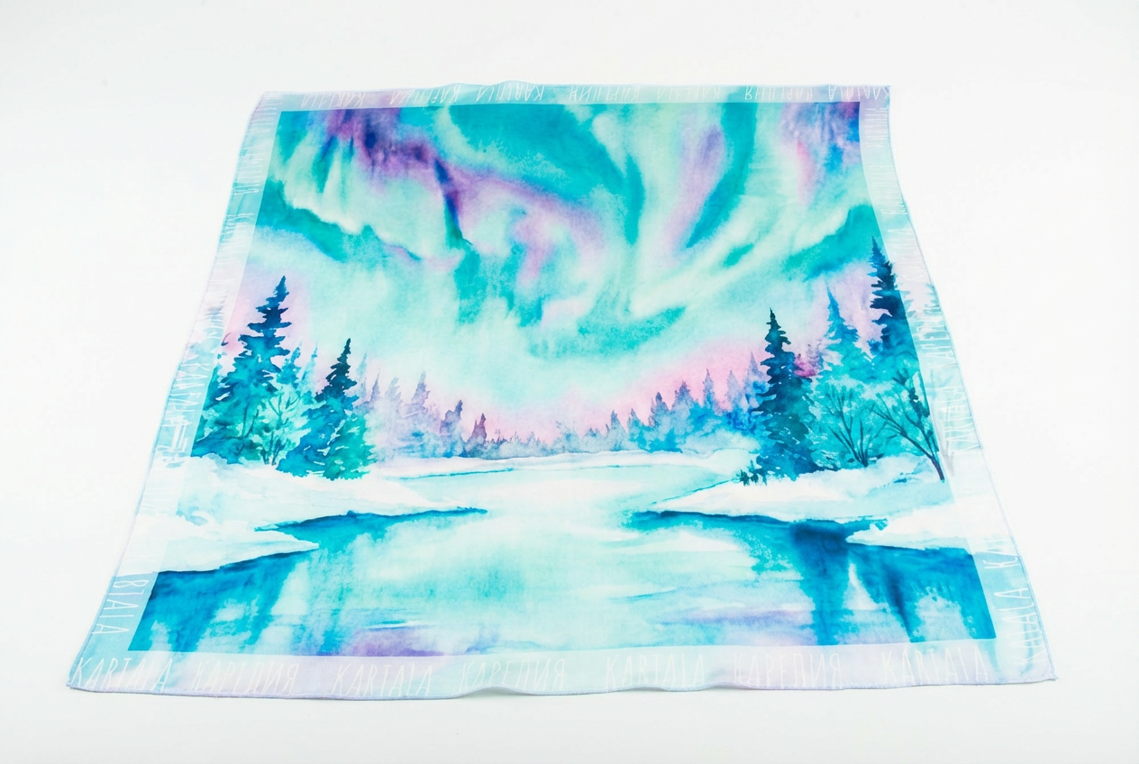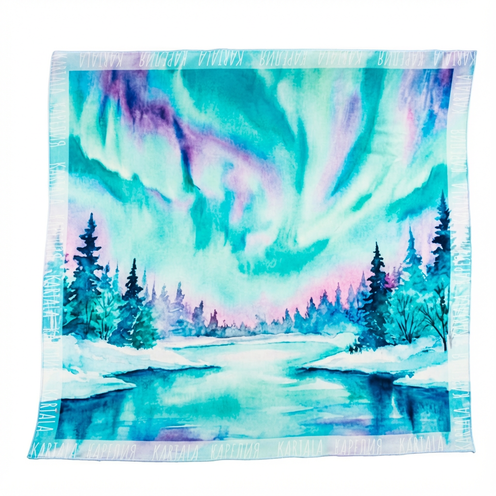 Лёгкий платок из "шелка Armani" с акварельным принтом, вдохновлённым Карелией: зимнее озеро, силуэты хвойного леса и сияние северного неба в бирюзово‑лиловых оттенках. Платок красиво драпируется, мягко ложится на шею и добавляет образу «воздуха», как прогулка по звенящему чистотой и тишиной морозному утру. По краю декоративная рамка с надписью KARELIA КАРЕЛИЯ, подчёркивающая сувенирный характер и связь с Севером.