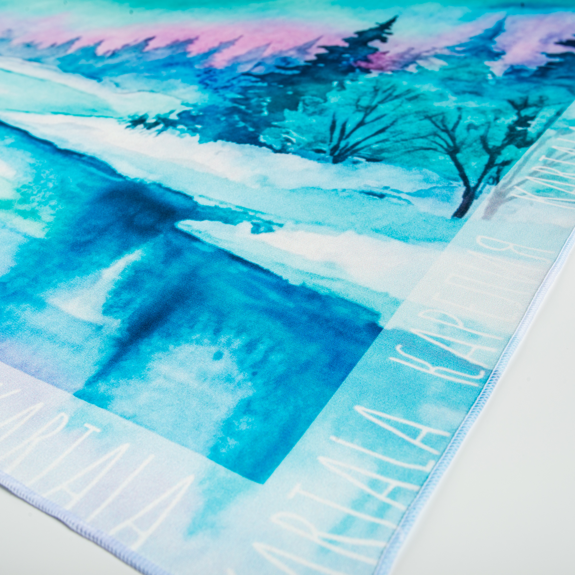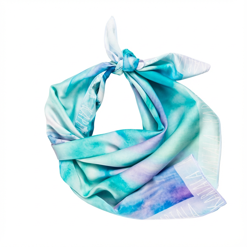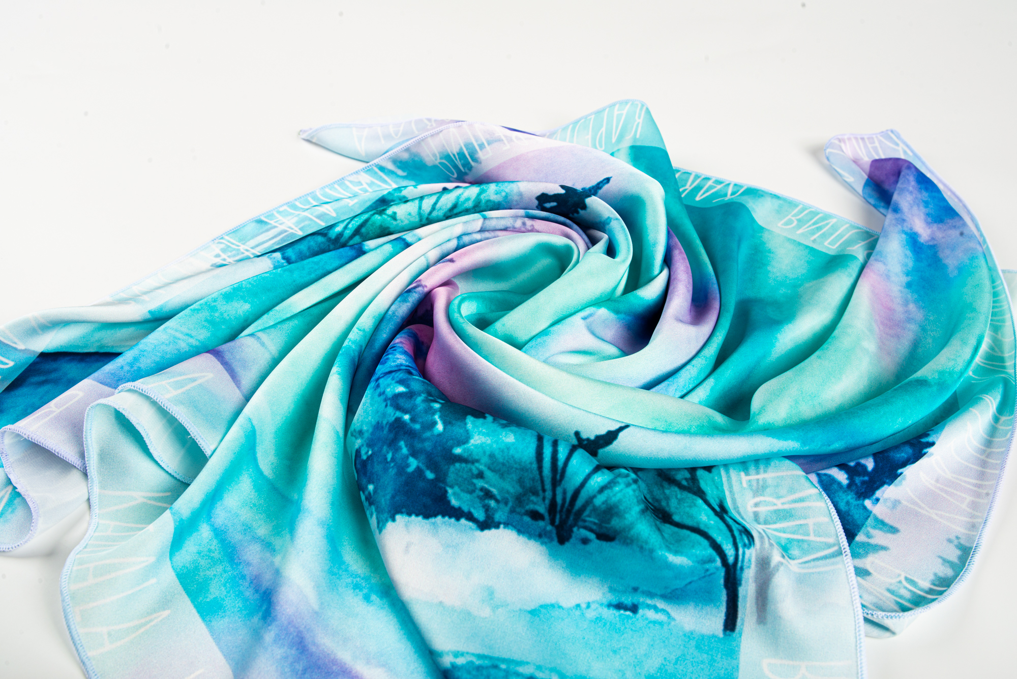 Лёгкий платок из "шелка Armani" с акварельным принтом, вдохновлённым Карелией: зимнее озеро, силуэты хвойного леса и сияние северного неба в бирюзово‑лиловых оттенках. Платок красиво драпируется, мягко ложится на шею и добавляет образу «воздуха», как прогулка по звенящему чистотой и тишиной морозному утру. По краю декоративная рамка с надписью KARELIA КАРЕЛИЯ, подчёркивающая сувенирный характер и связь с Севером.