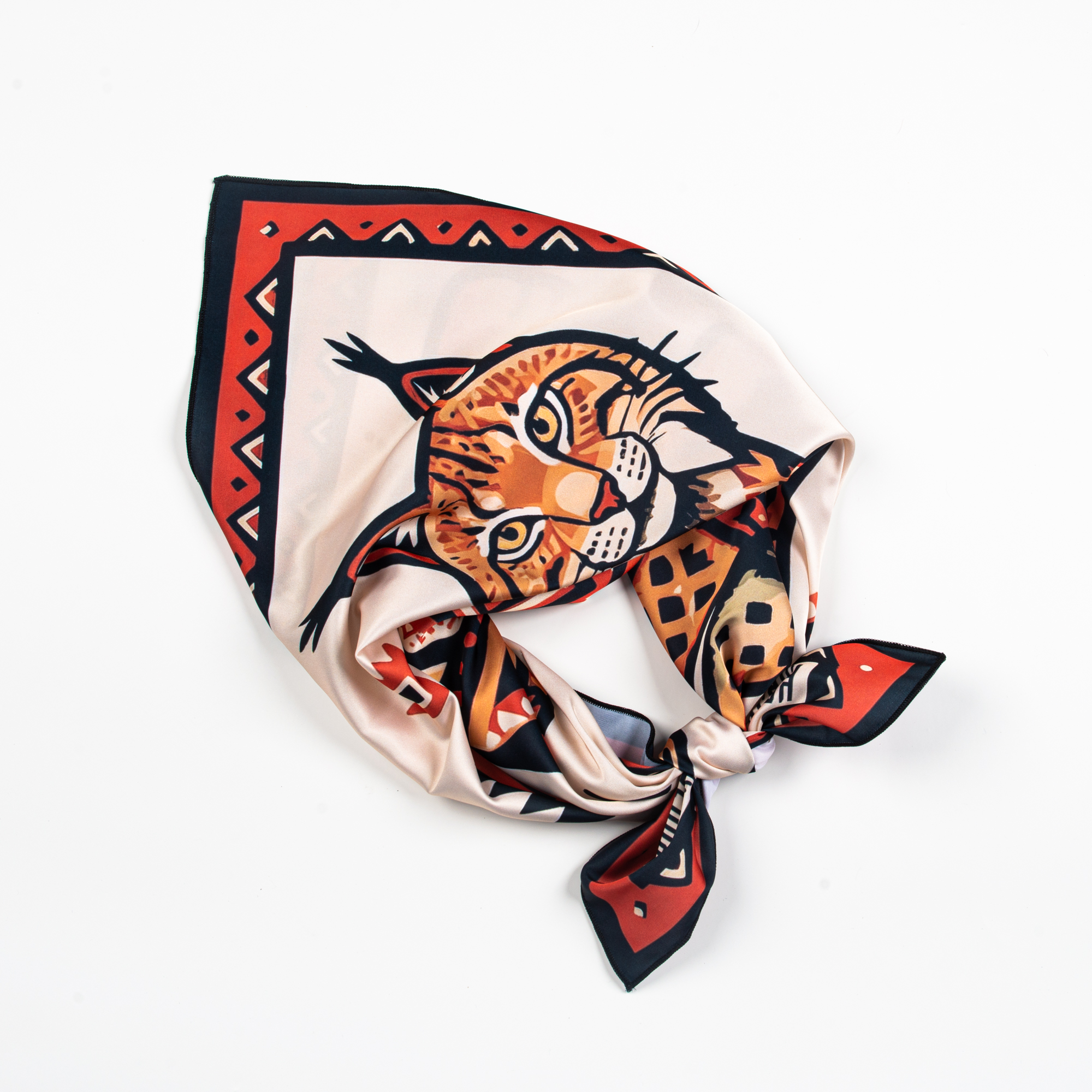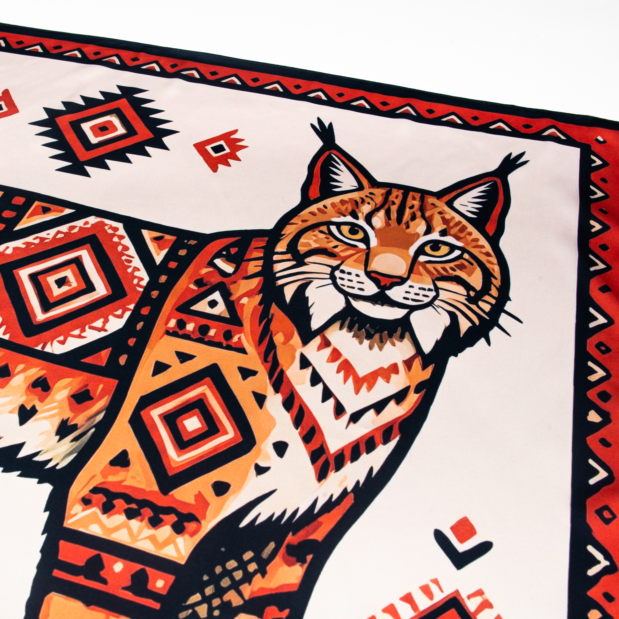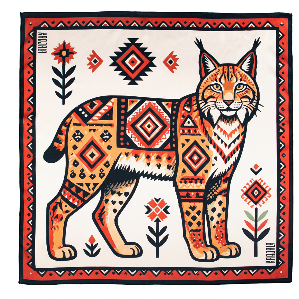 Эффектный платок с рысью - символом северной силы и лесной свободы в ярком карельском этно‑стиле. В центре композиции грациозная рысь, украшенная геометрическими орнаментами в красно‑оранжево‑чёрной гамме, словно узор на традиционном текстиле. По краю идёт декоративная рамка с этно‑каймой, а надпись KARJALA подчёркивает связь с Карелией и делает платок узнаваемым сувениром. Платок красиво драпируется и мгновенно становится главным акцентом в образе для города, поездок и подарка «с Севером внутри».