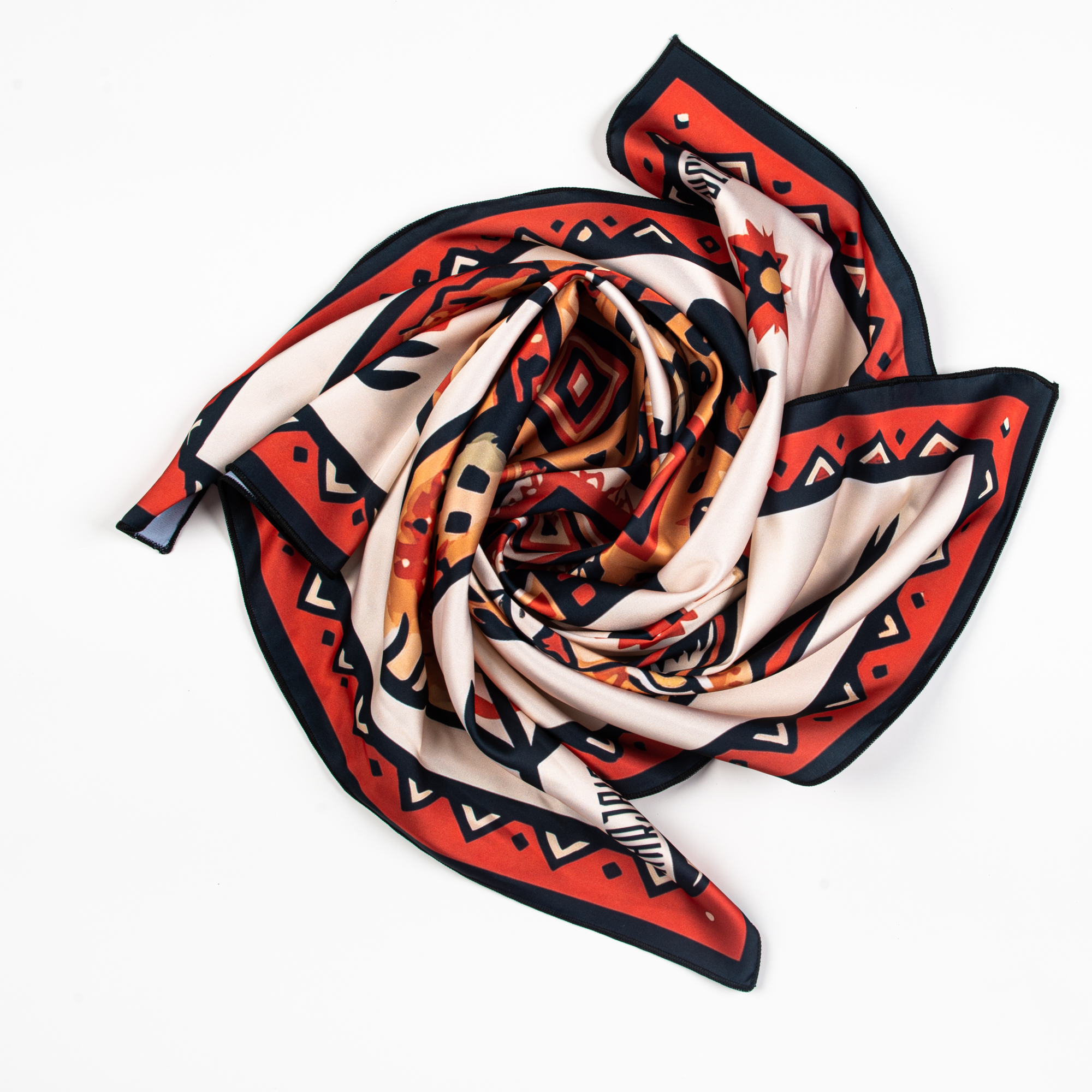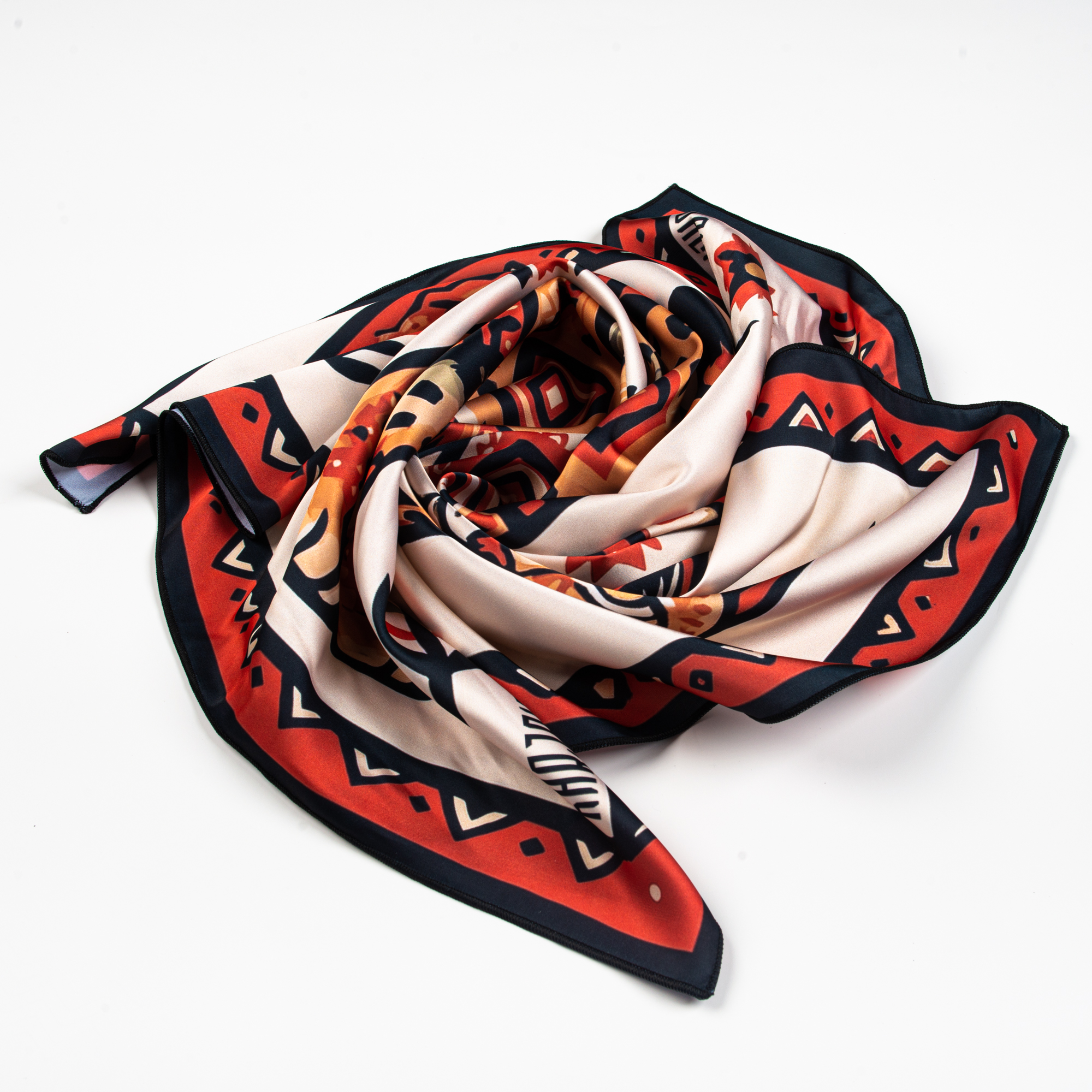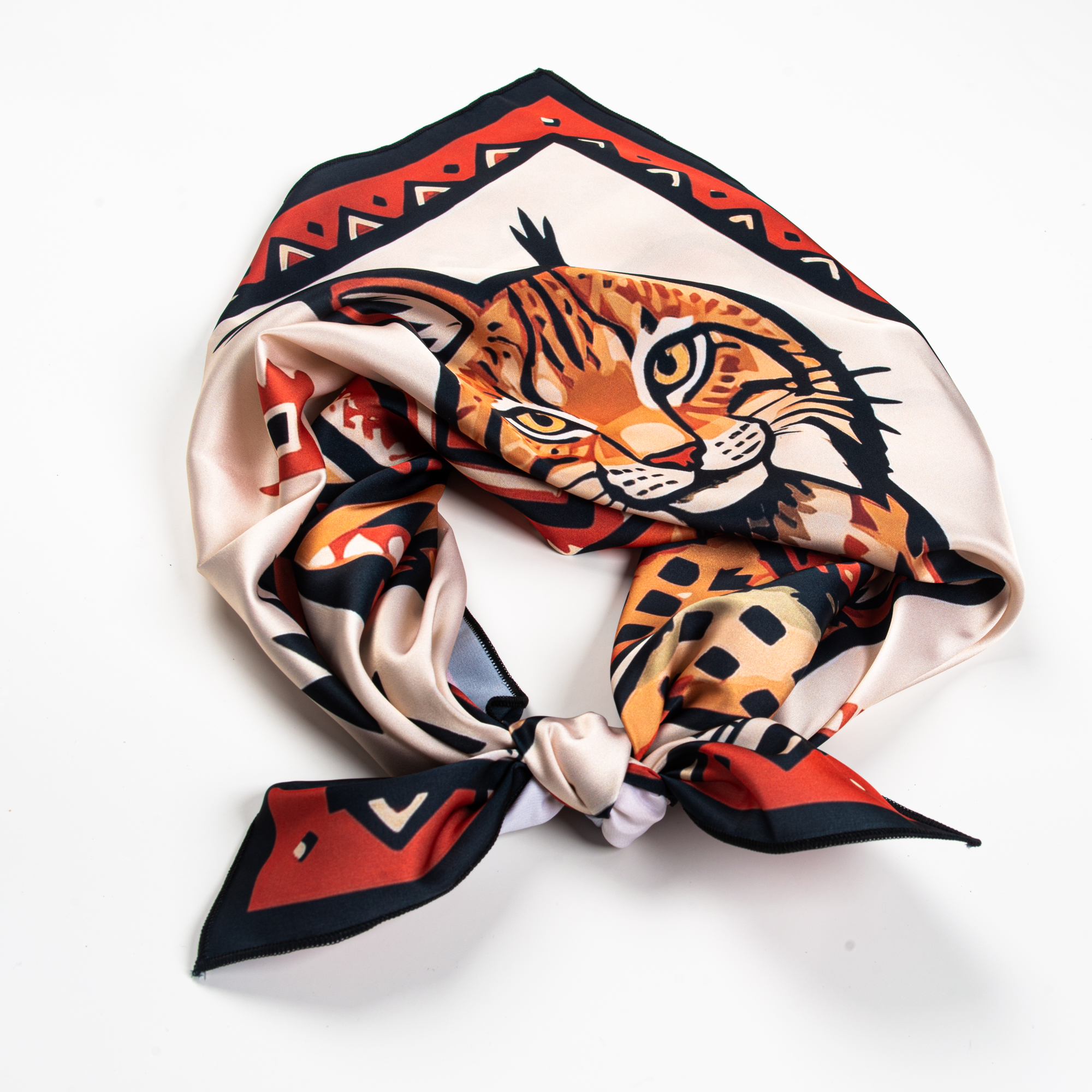 Эффектный платок с рысью - символом северной силы и лесной свободы в ярком карельском этно‑стиле. В центре композиции грациозная рысь, украшенная геометрическими орнаментами в красно‑оранжево‑чёрной гамме, словно узор на традиционном текстиле. По краю идёт декоративная рамка с этно‑каймой, а надпись KARJALA подчёркивает связь с Карелией и делает платок узнаваемым сувениром. Платок красиво драпируется и мгновенно становится главным акцентом в образе для города, поездок и подарка «с Севером внутри».