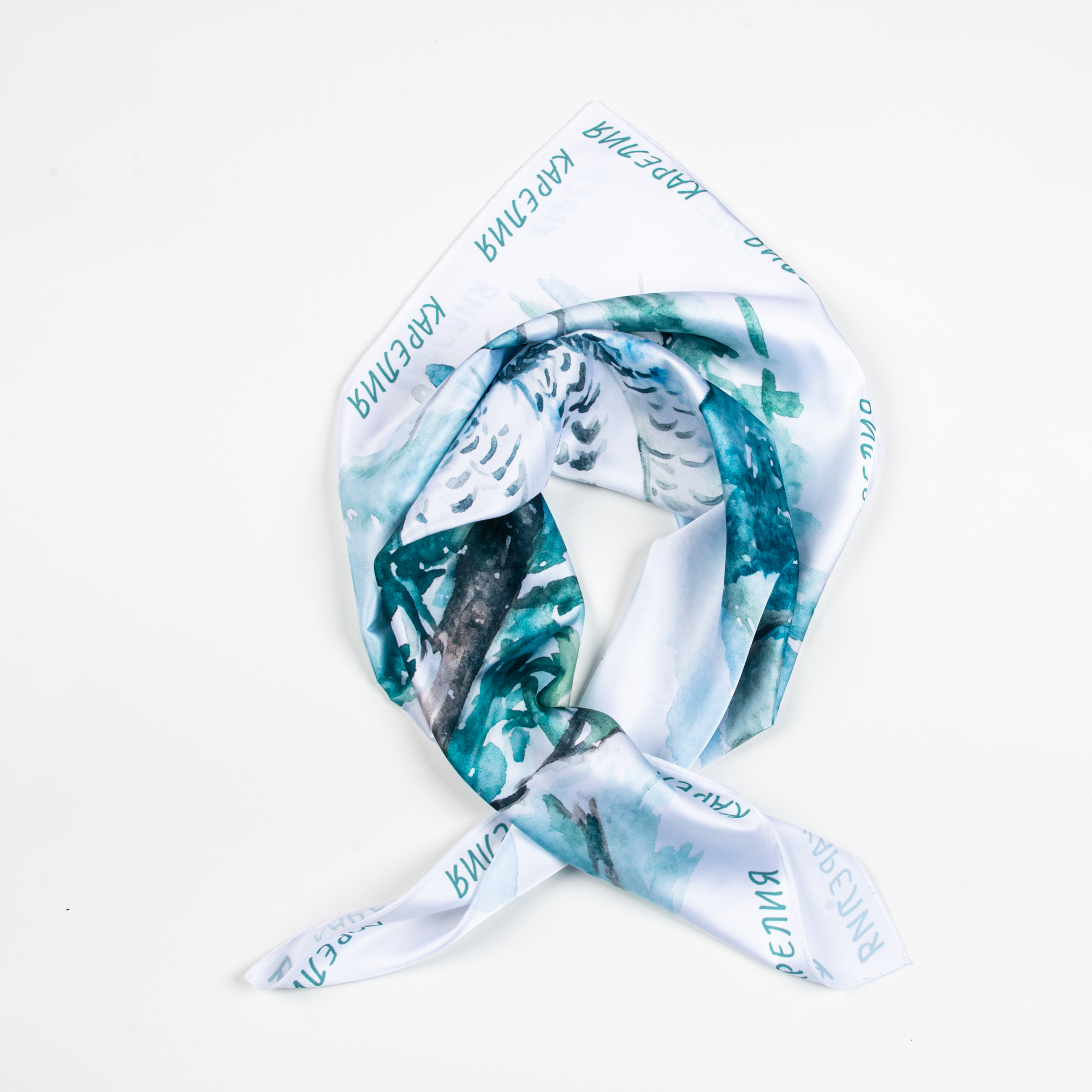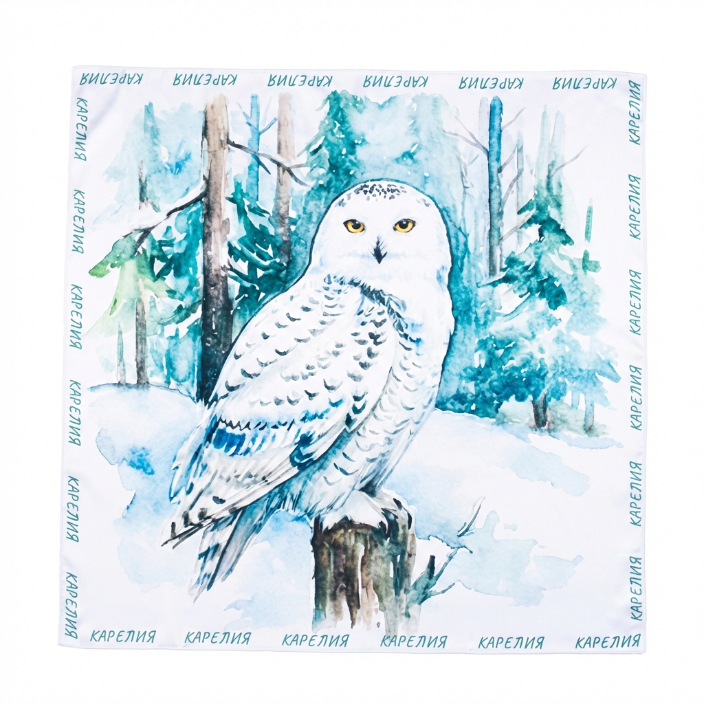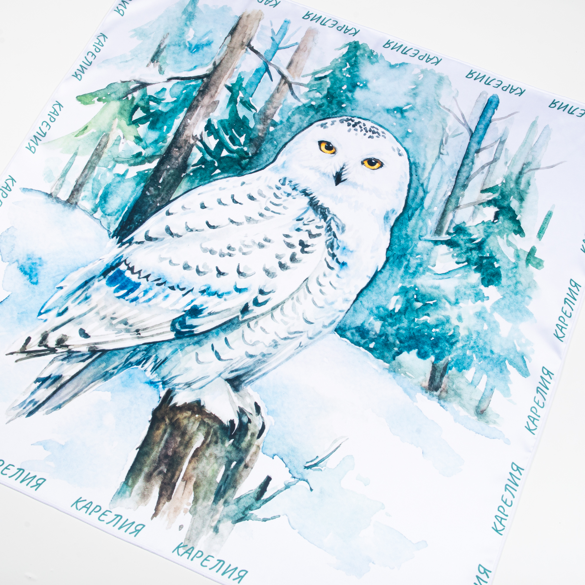 Шейный платок «Полярная сова. Карелия» - нежный, светлый аксессуар с атмосферой северной зимы. В центре полярная сова с янтарным взглядом, написанная в акварельной манере: мягкие голубые тени на белом оперении, лёгкие штрихи и ощущение морозного воздуха. На фоне - заснеженный карельский лес в холодной бирюзово‑синей палитре, а по краю платка повторяется надпись «КАРЕЛИЯ», как тихая подпись к месту силы и памяти о путешествии.
