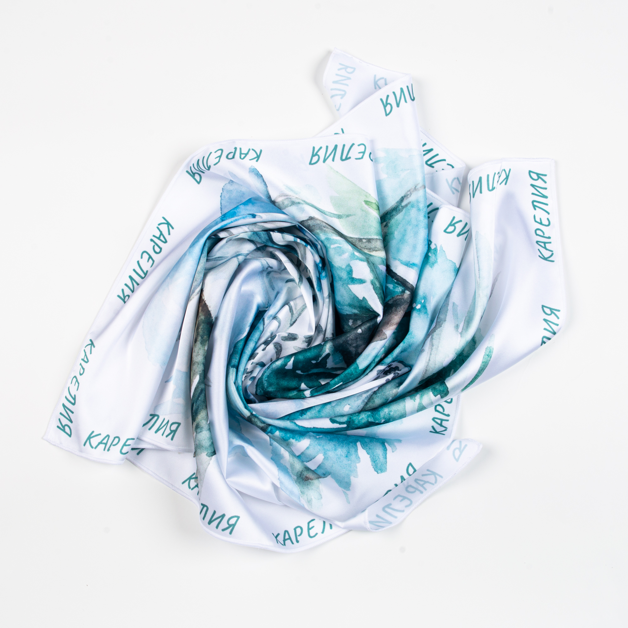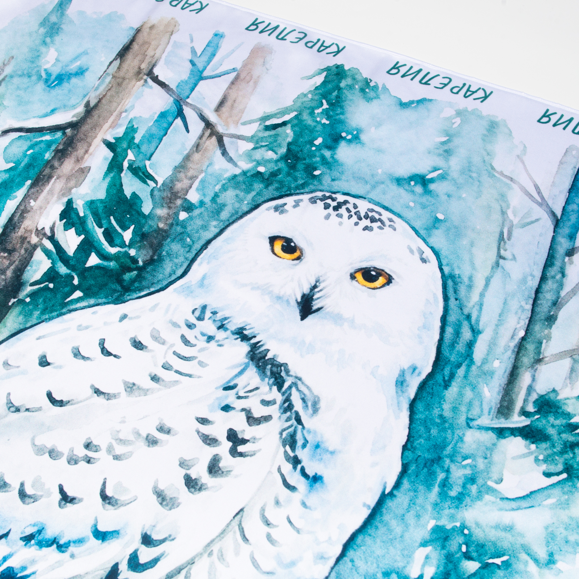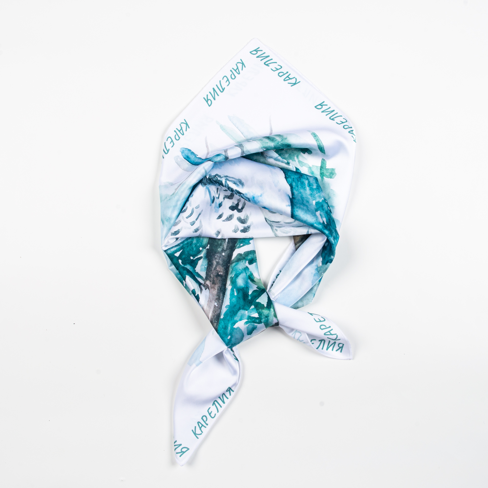 Шейный платок «Полярная сова. Карелия» - нежный, светлый аксессуар с атмосферой северной зимы. В центре полярная сова с янтарным взглядом, написанная в акварельной манере: мягкие голубые тени на белом оперении, лёгкие штрихи и ощущение морозного воздуха. На фоне - заснеженный карельский лес в холодной бирюзово‑синей палитре, а по краю платка повторяется надпись «КАРЕЛИЯ», как тихая подпись к месту силы и памяти о путешествии.