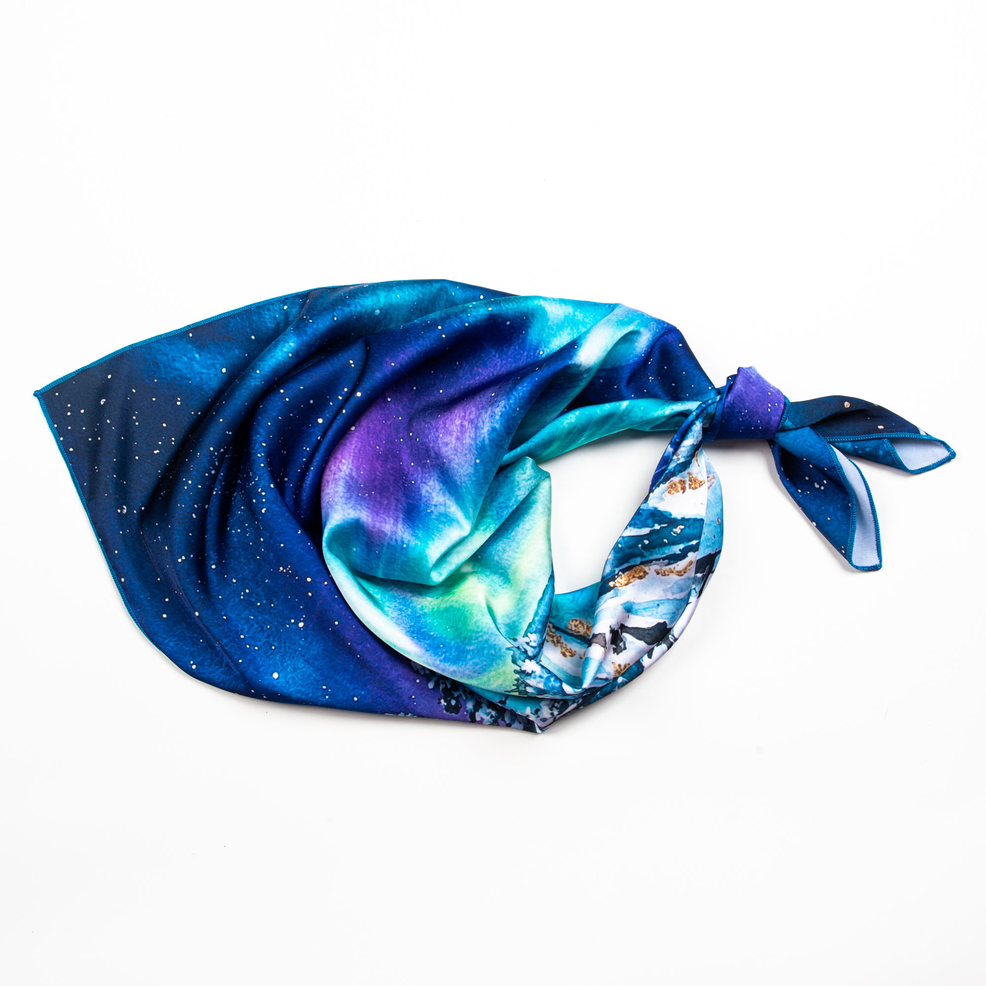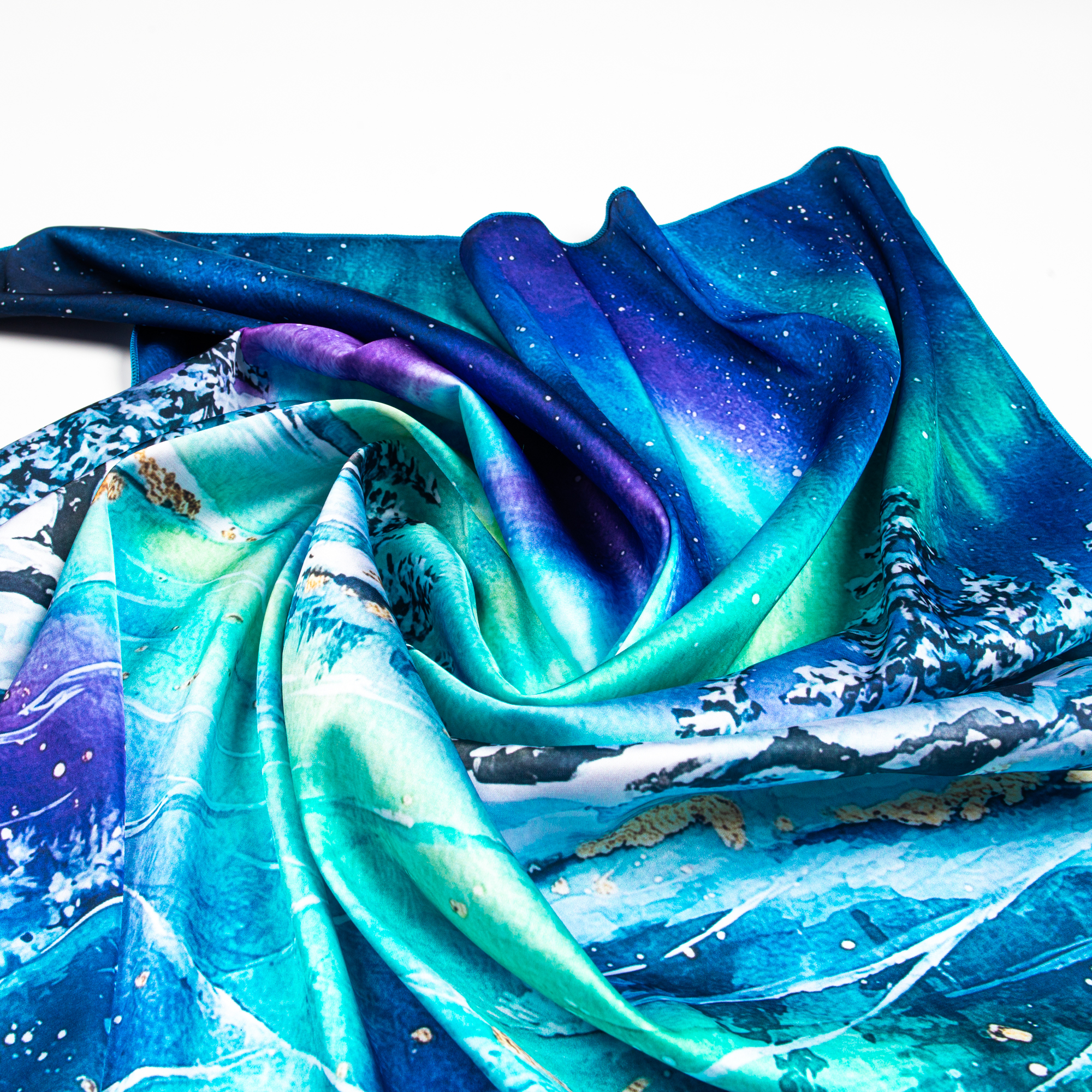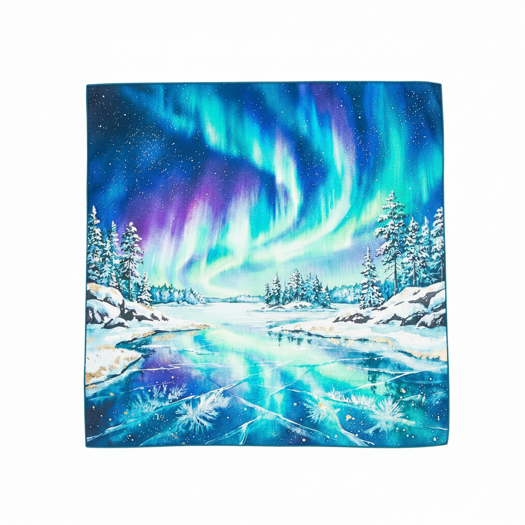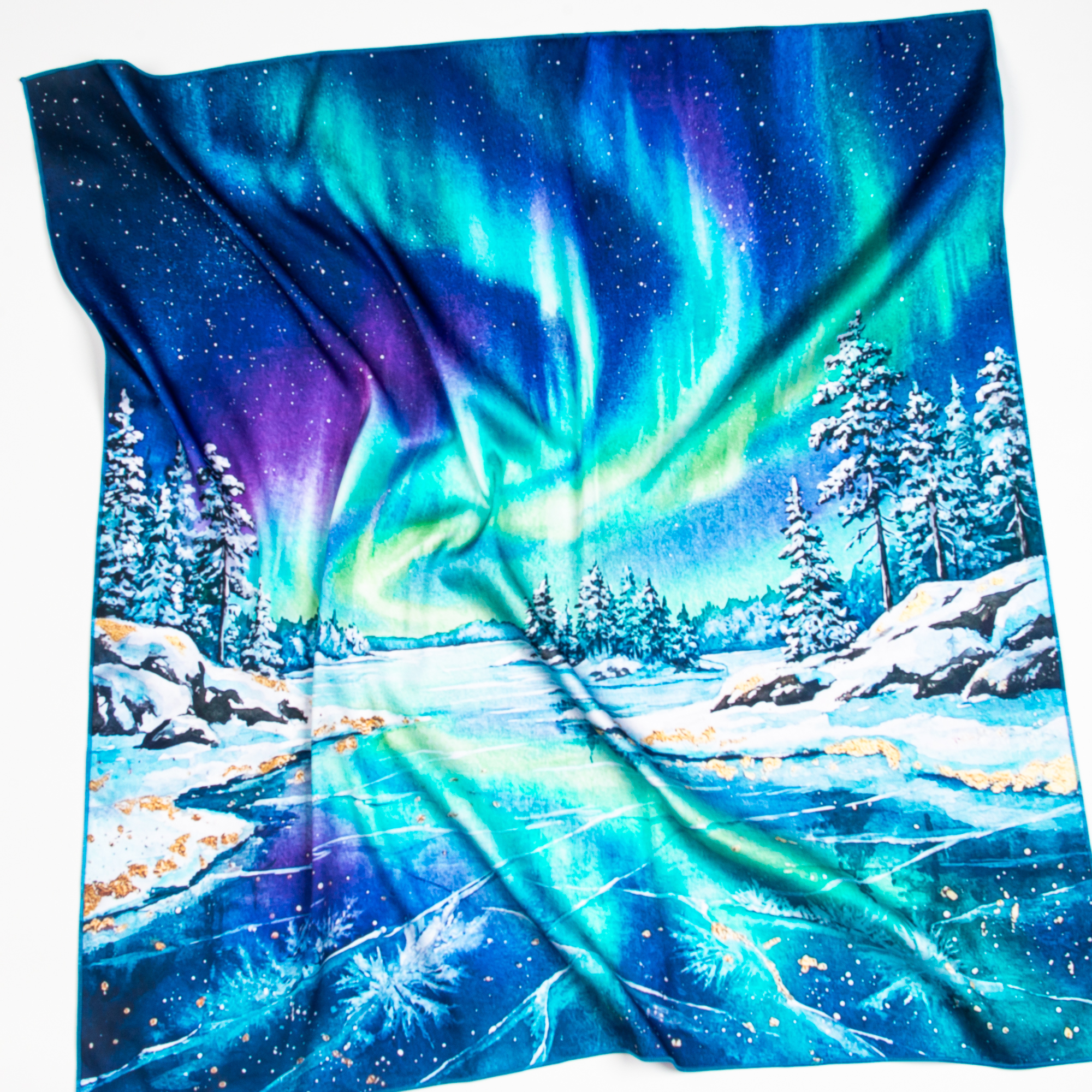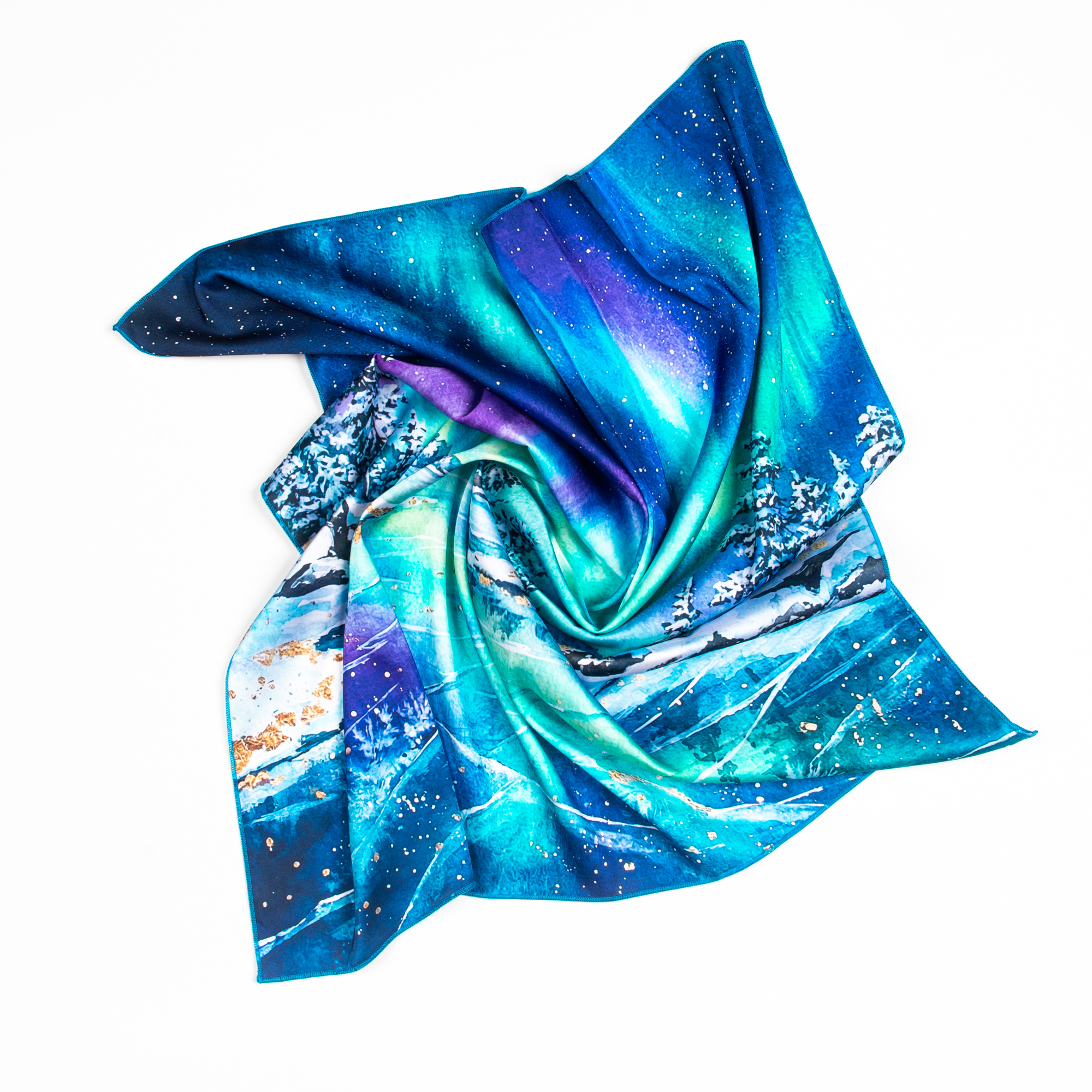 Лёгкий шейный платок из искуственного шелка с акварельным зимним пейзажем Карелии: заснеженные сосны, скалы у берега и ледяная гладь озера, над которой разливается яркое северное сияние в бирюзово‑синих и лиловых оттенках. Рисунок выглядит как открытка из путешествия на Север: глубокие цвета, звёздное небо и мягкое свечение, которое сразу задаёт настроение. Платок красиво драпируется, мягко ложится на шею и становится выразительным акцентом в образе для прогулок, поездок и как памятный сувенир из Карелии.