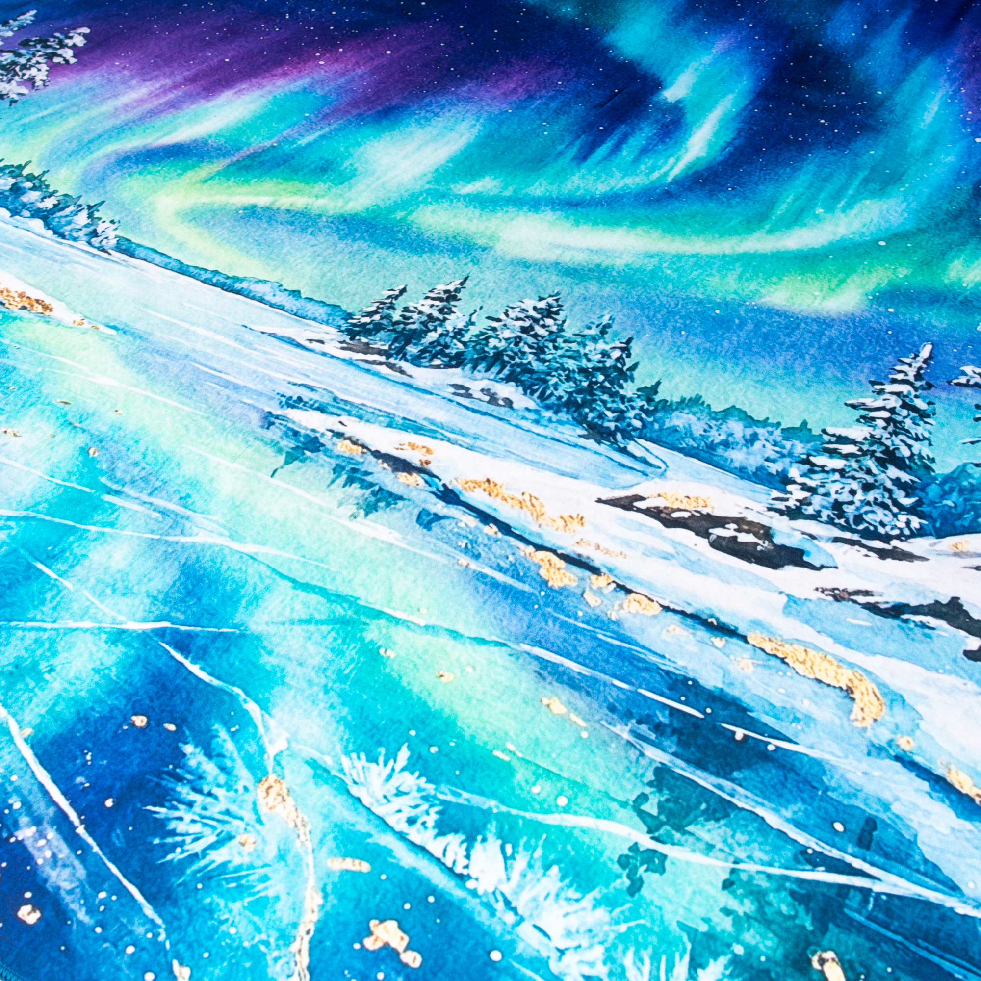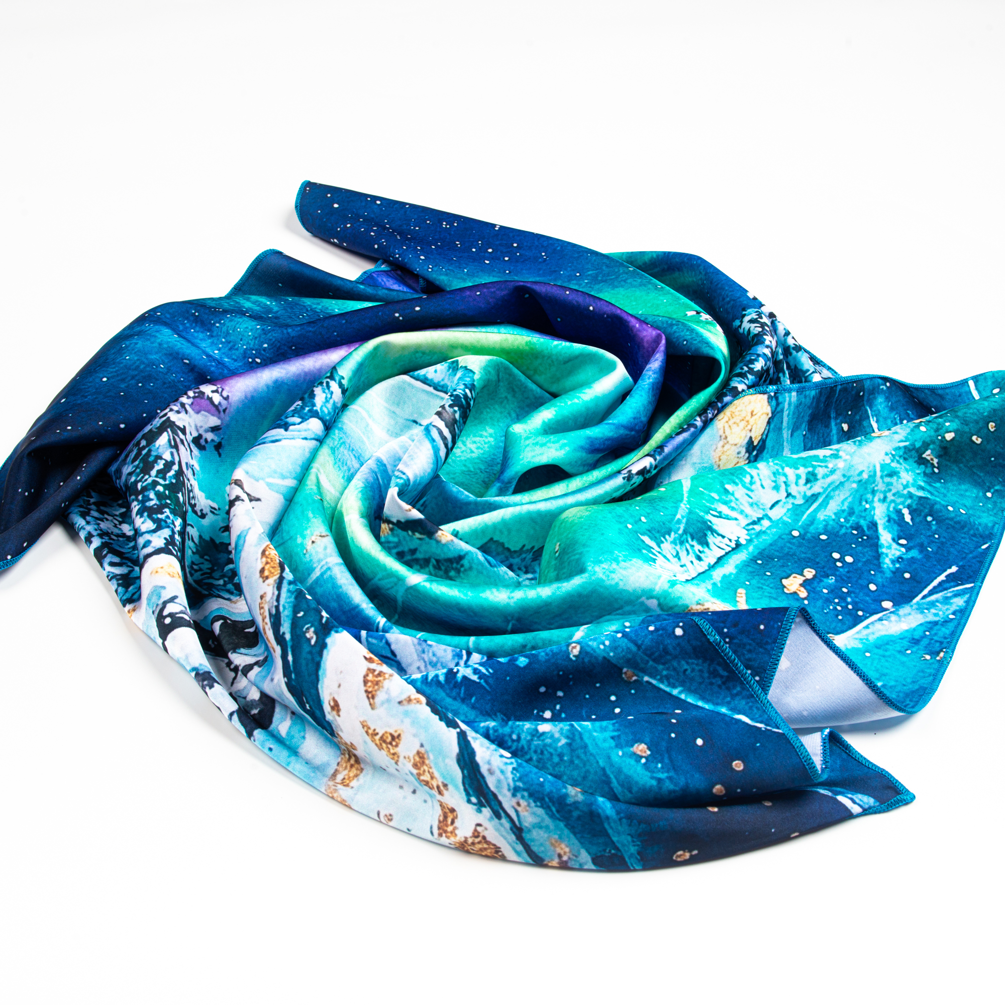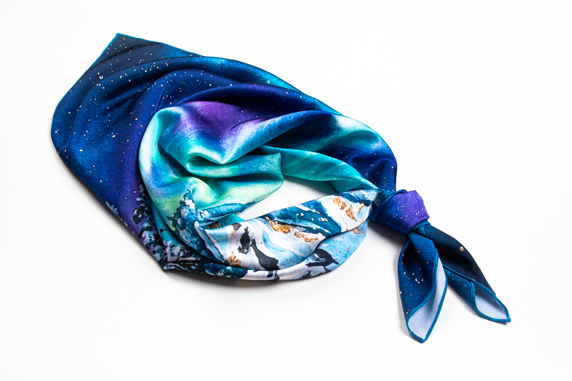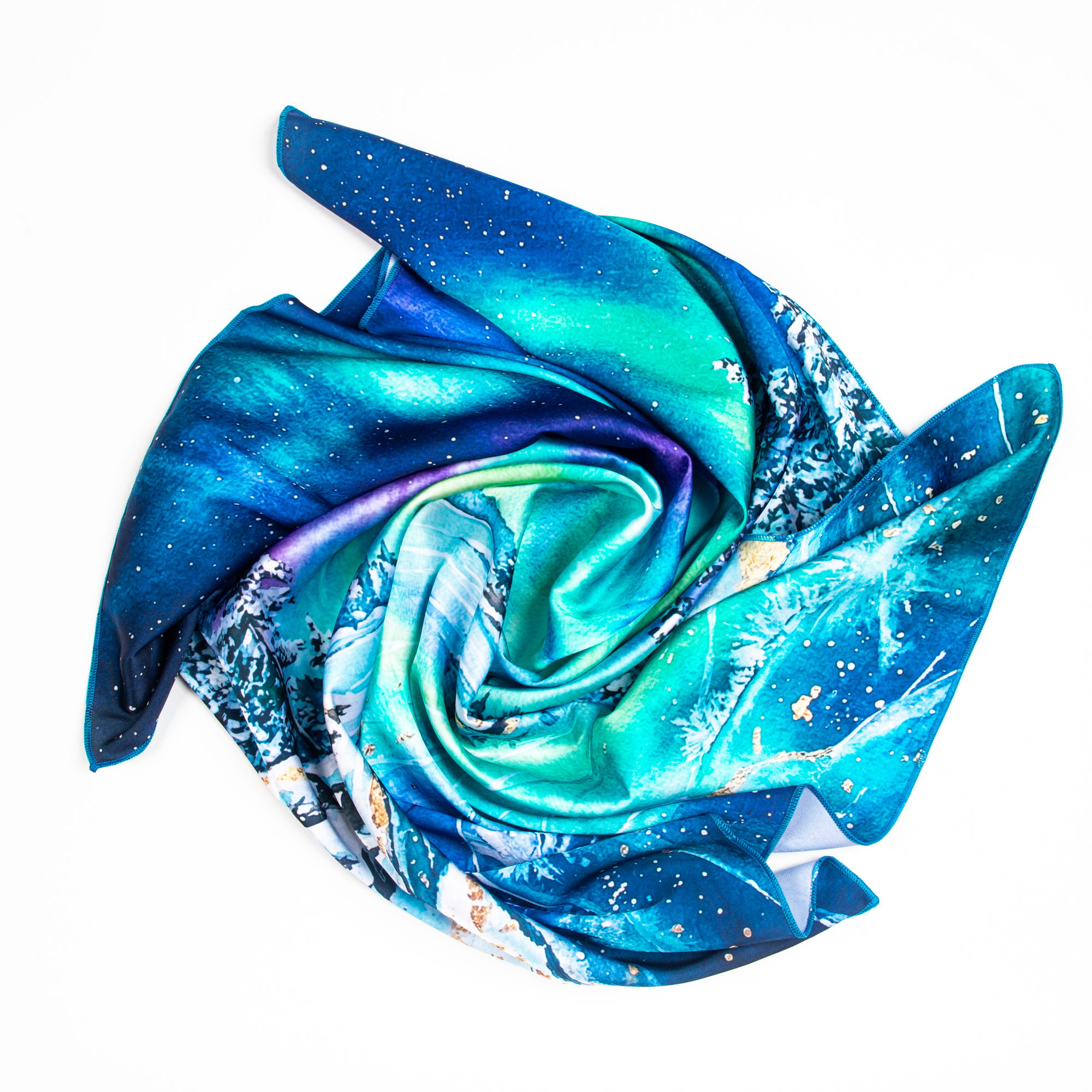 Лёгкий шейный платок из искуственного шелка с акварельным зимним пейзажем Карелии: заснеженные сосны, скалы у берега и ледяная гладь озера, над которой разливается яркое северное сияние в бирюзово‑синих и лиловых оттенках. Рисунок выглядит как открытка из путешествия на Север: глубокие цвета, звёздное небо и мягкое свечение, которое сразу задаёт настроение. Платок красиво драпируется, мягко ложится на шею и становится выразительным акцентом в образе для прогулок, поездок и как памятный сувенир из Карелии.