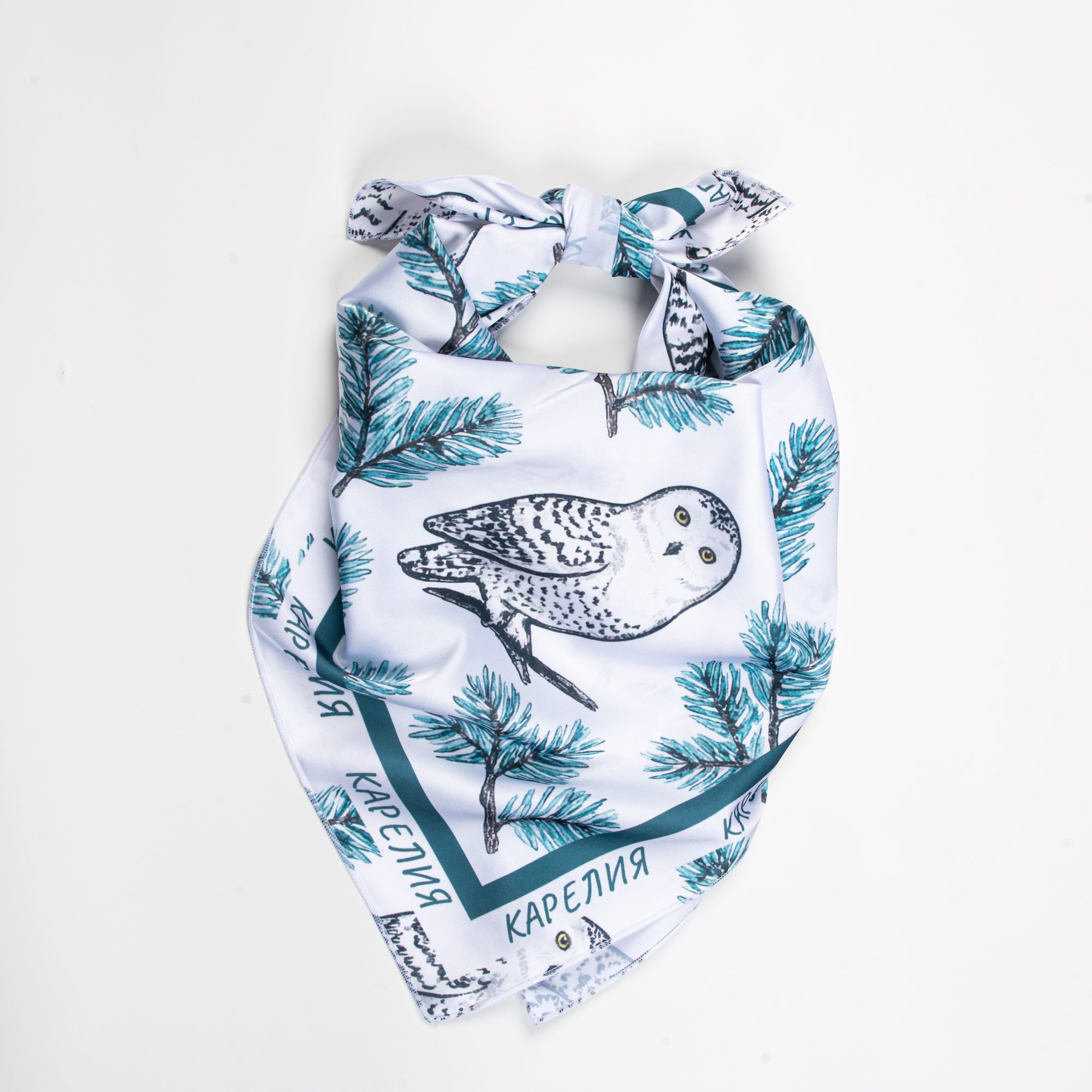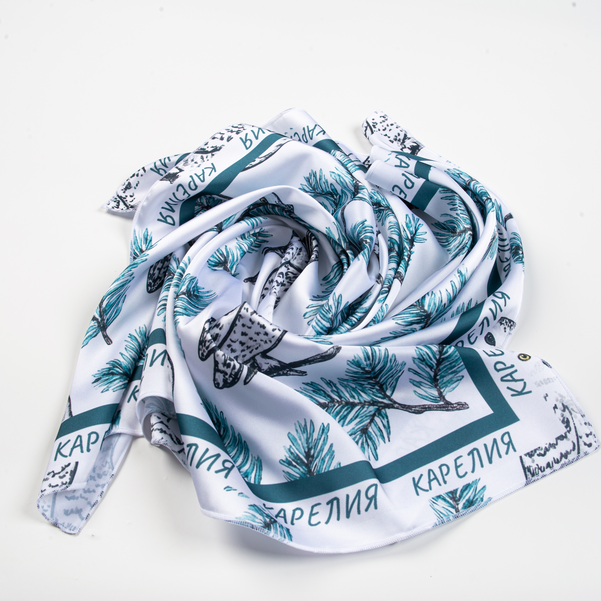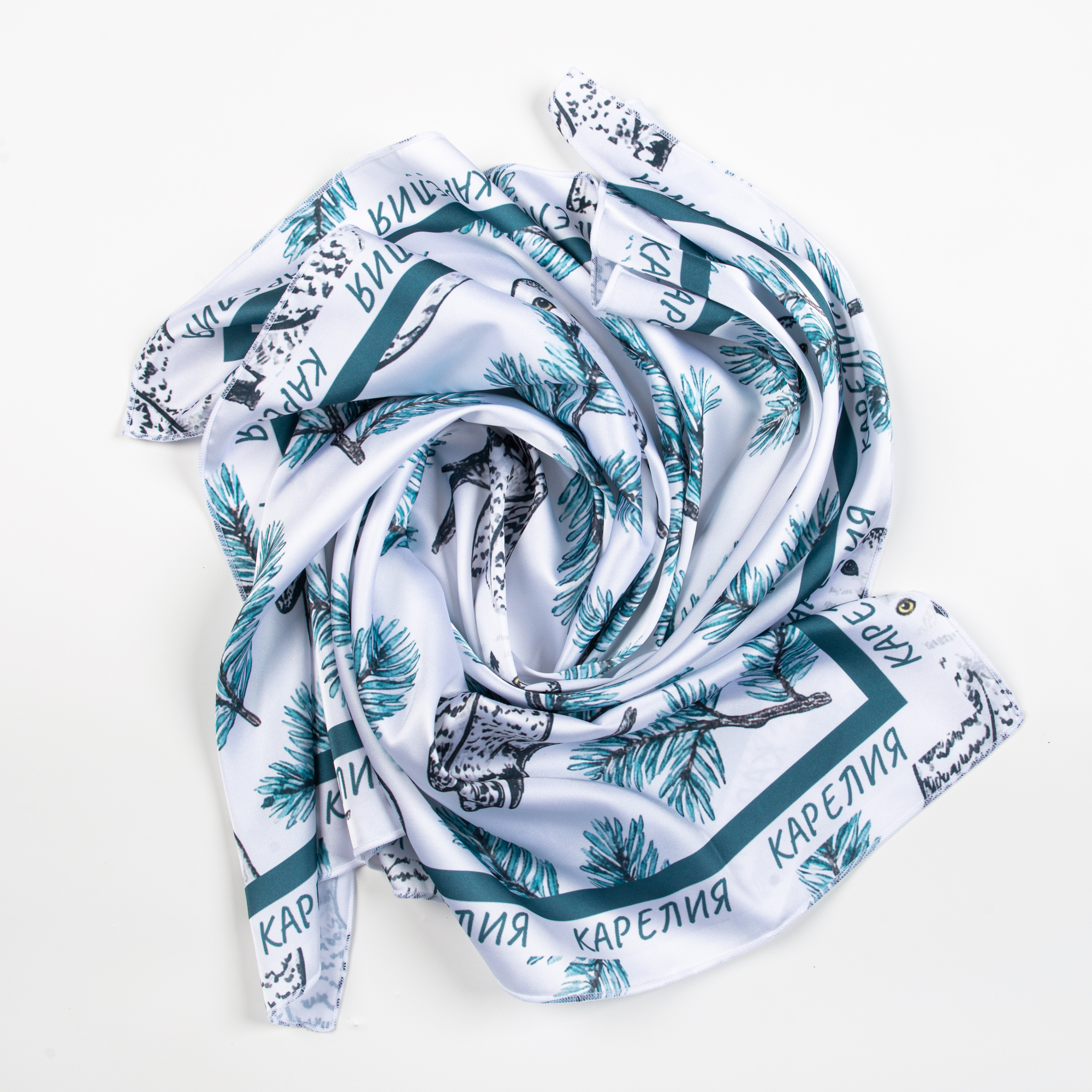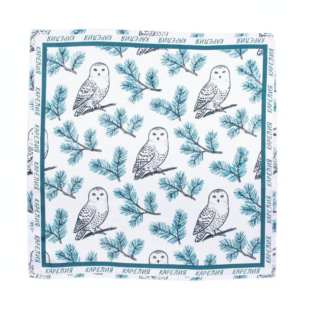 Лёгкий платок из шелка Armani с нежным северным принтом: белые совушки на ветках хвои, будто из зимнего карельского леса, тихого, светлого и морозного. Графичные силуэты птиц и холодные бирюзово‑синие оттенки хвои делают дизайн спокойным и универсальным, а декоративная рамка с повторявающейся надписью «КАРЕЛИЯ» подчёркивает сувенирный характер платка. Он красиво драпируется, мягко ложится на шею и добавляет образу ощущение свежести и «северного воздуха». Отличный вариант для себя и в подарок.