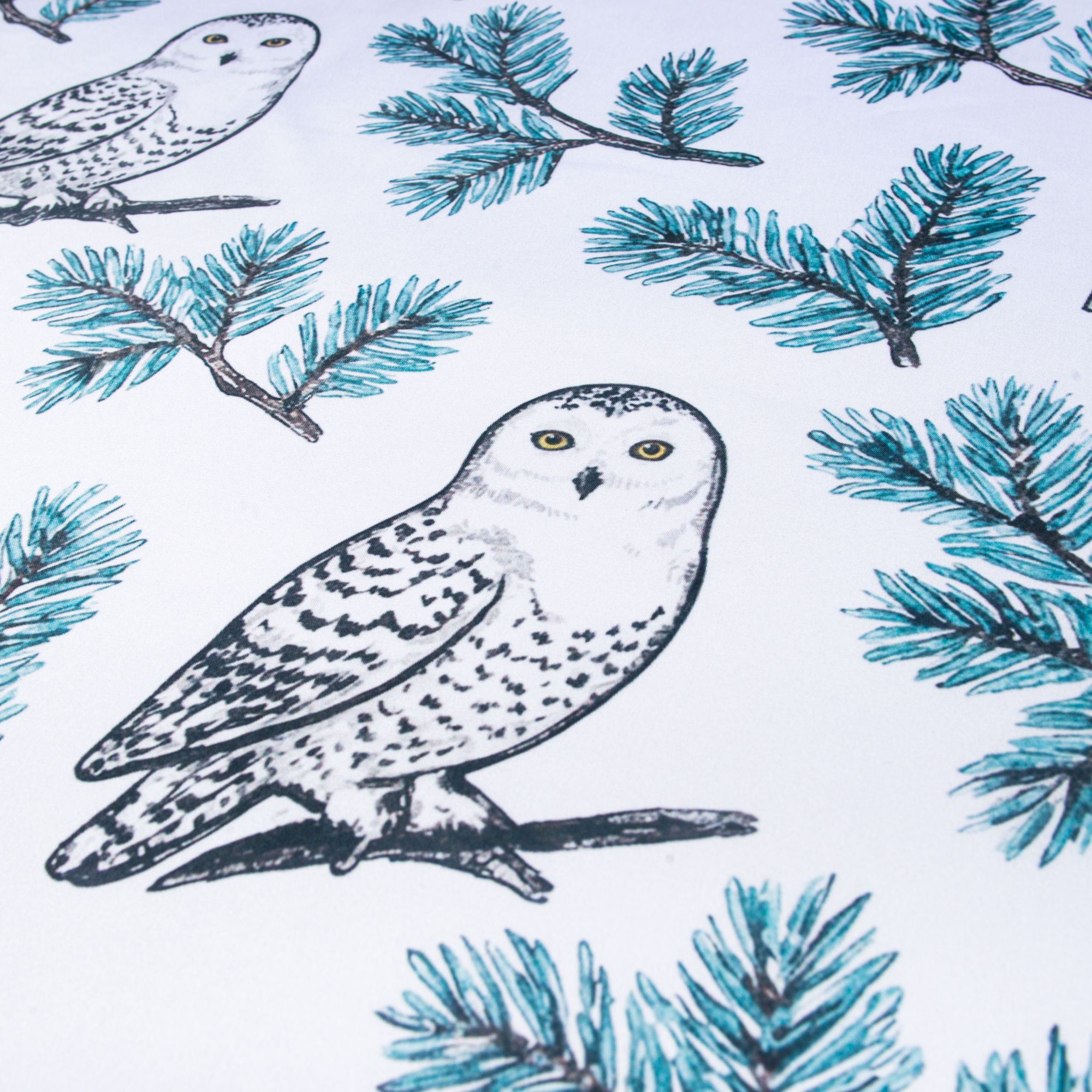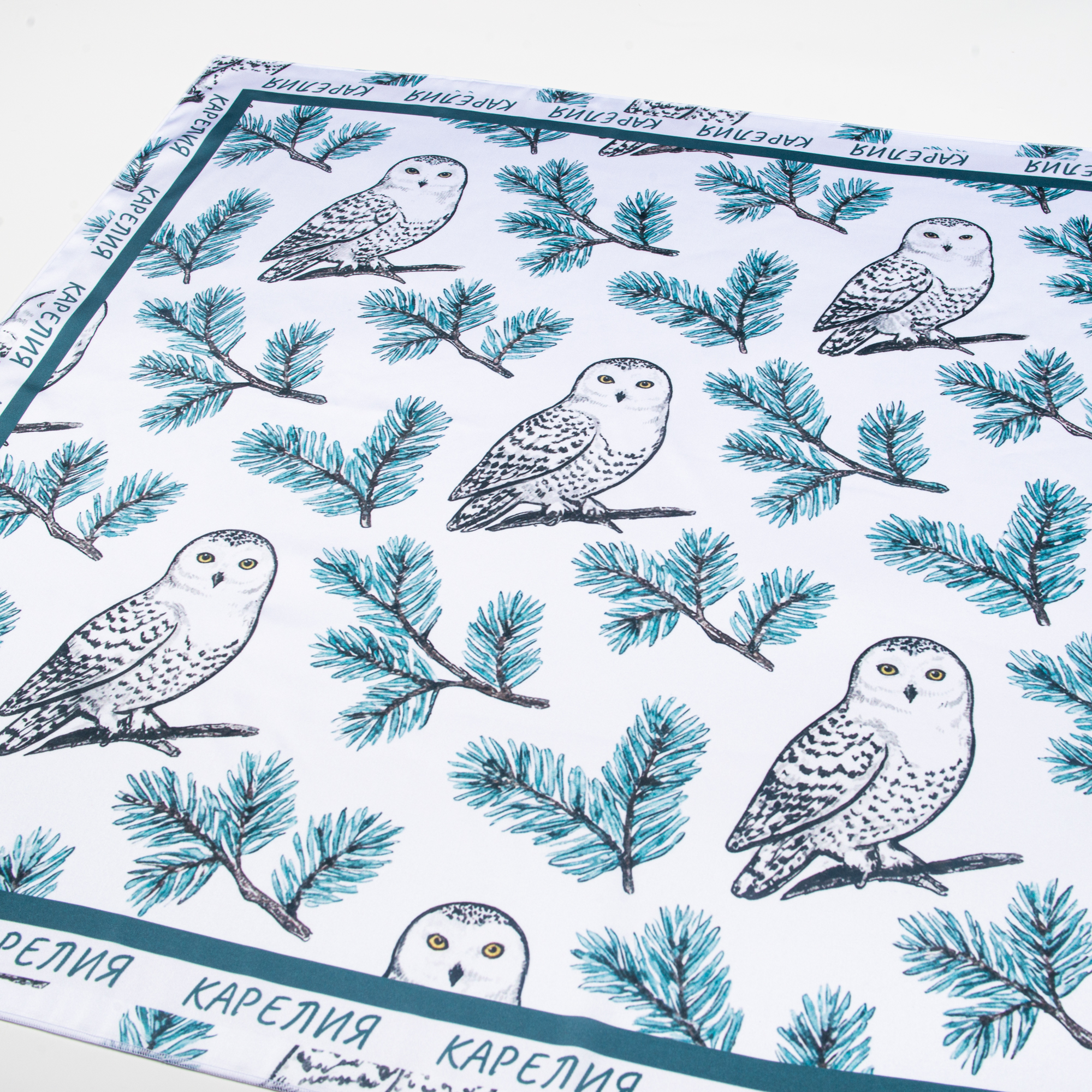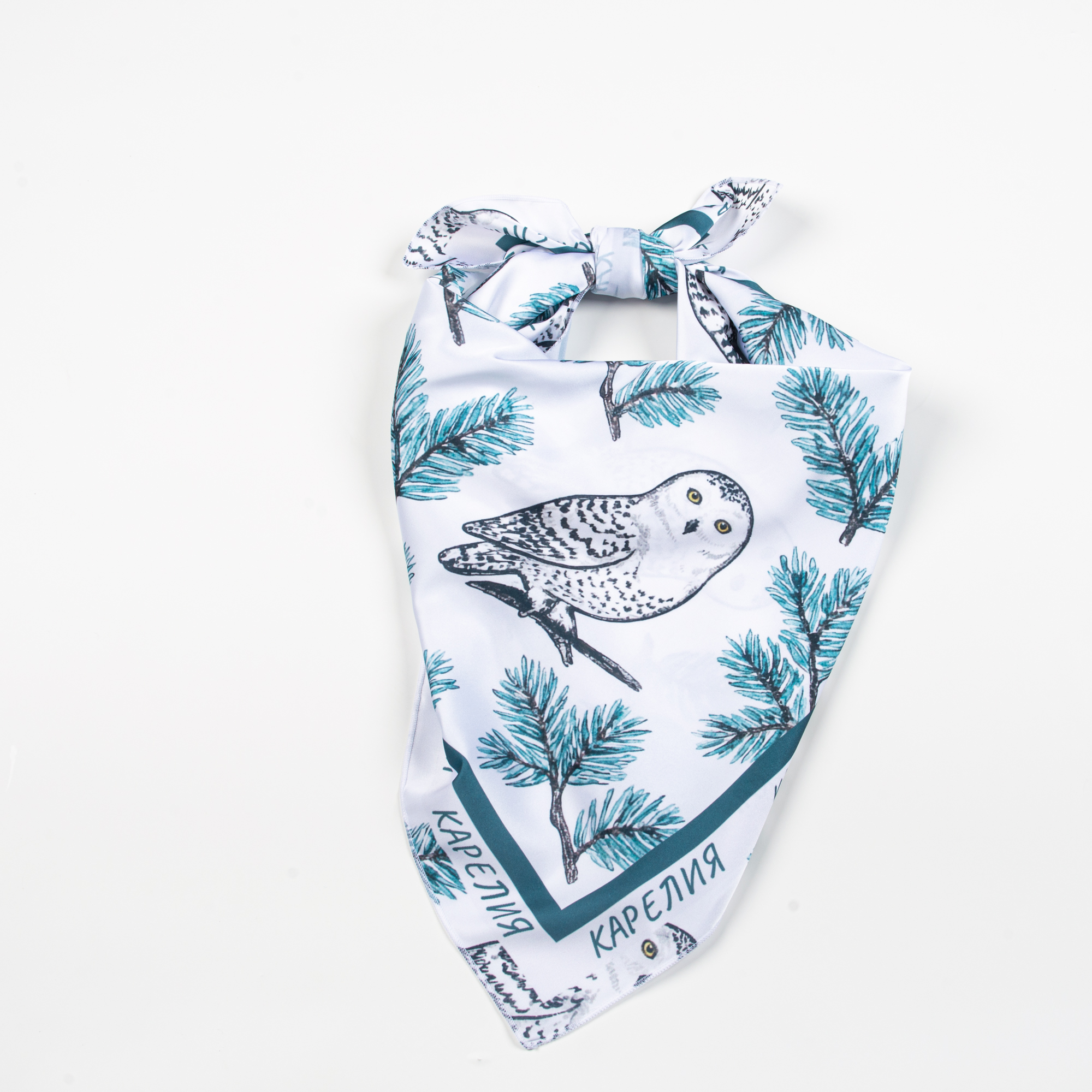 Лёгкий платок из шелка Armani с нежным северным принтом: белые совушки на ветках хвои, будто из зимнего карельского леса, тихого, светлого и морозного. Графичные силуэты птиц и холодные бирюзово‑синие оттенки хвои делают дизайн спокойным и универсальным, а декоративная рамка с повторявающейся надписью «КАРЕЛИЯ» подчёркивает сувенирный характер платка. Он красиво драпируется, мягко ложится на шею и добавляет образу ощущение свежести и «северного воздуха». Отличный вариант для себя и в подарок.