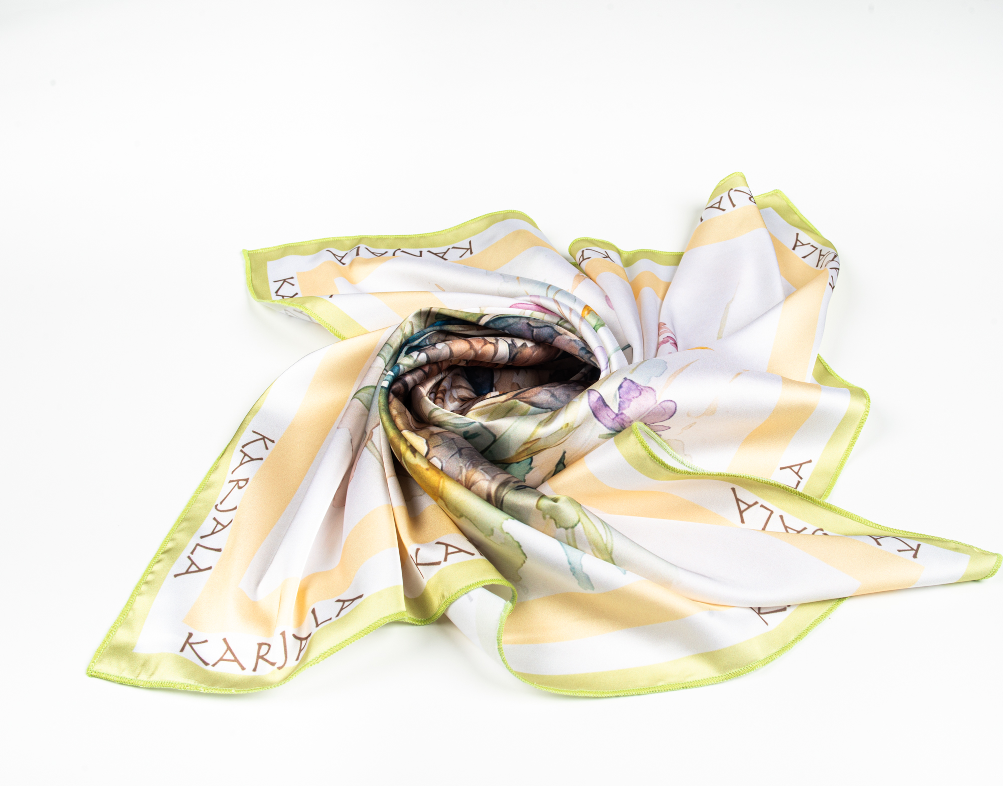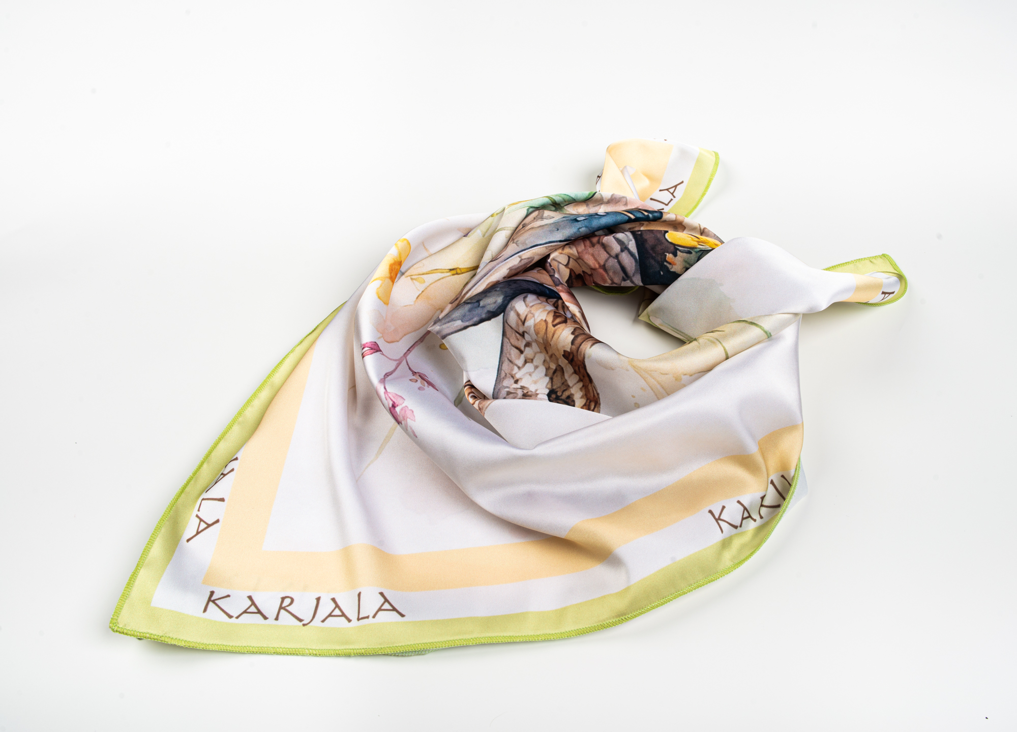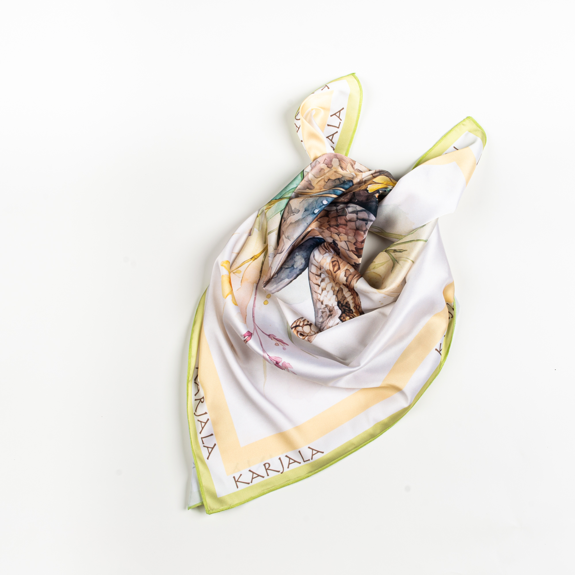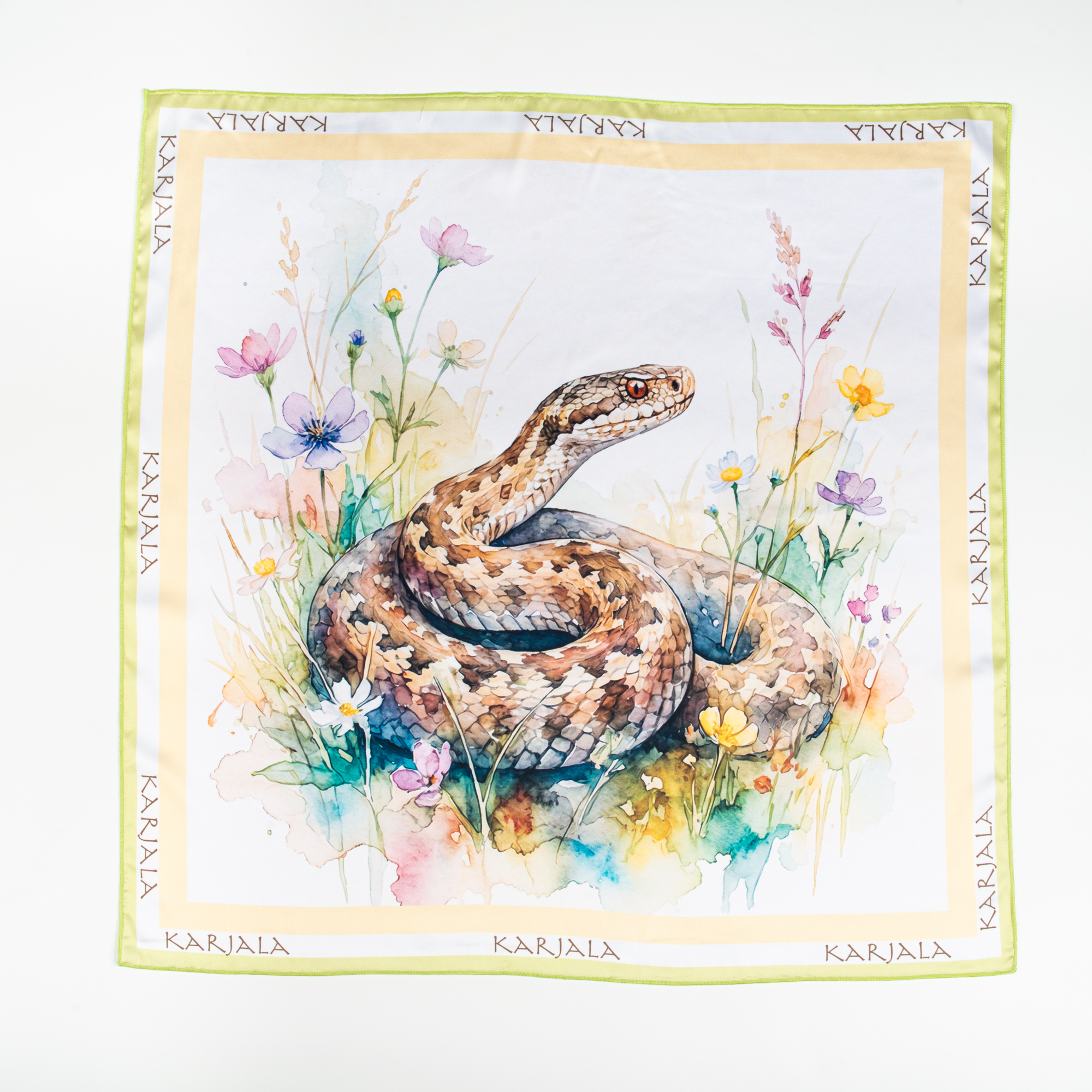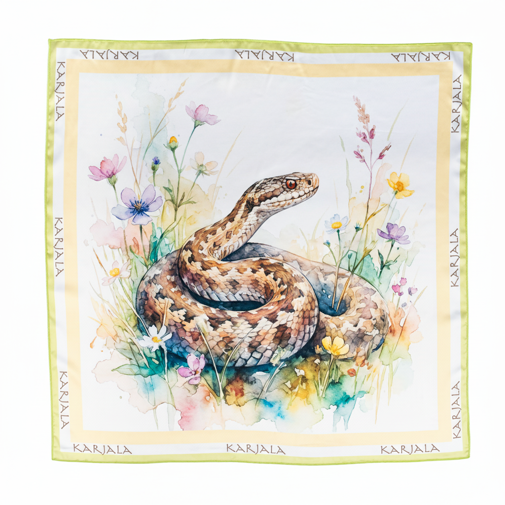Шейный платок «Змея» - акцентный аксессуар с тонкой северной эстетикой и мягкой акварельной подачей. В центре изящная гадюка, написанная в реалистичной акварельной манере: чёткий взгляд, природная фактура чешуи и спокойная “земляная” палитра. Вокруг нежные полевые цветы и лёгкие цветовые разводы, создающие ощущение тёплого летнего воздуха. По бордюру повторяется надпись KARJALA, а светлая рамка с зелёным кантом делает композицию аккуратной и завершённой. Платок легко вписывается в гардероб и работает в любой сезон: добавляет образу характер, но остаётся нежным за счёт светлого фона и пастельных оттенков. Хорошо сочетается с базовыми цветами: молочным, бежевым, серым, денимом, хаки.