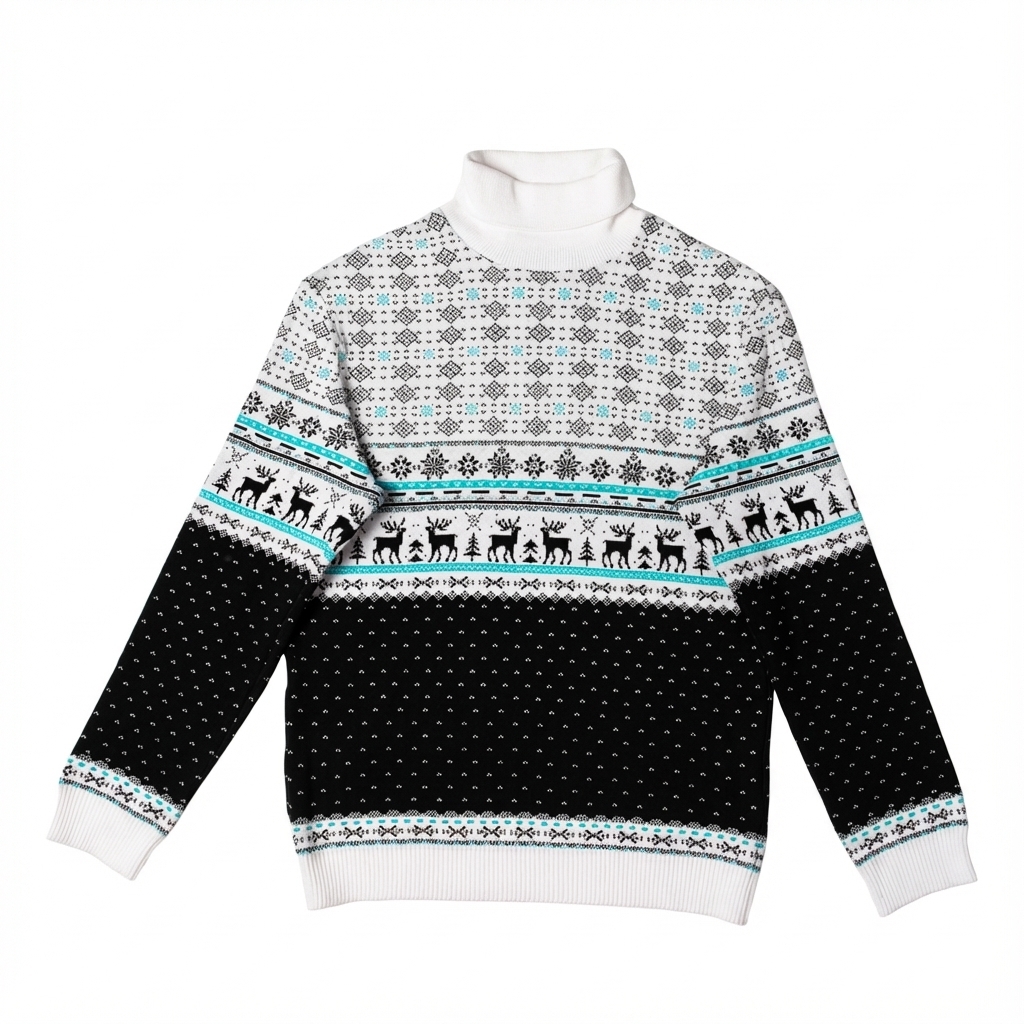 Тёплый и уютный вязаный свитер с высоким воротом - идеальный выбор для зимы и атмосферный сувенир с северным характером. Контрастный жаккардовый узор со снежинками и силуэтами оленей смотрится эффектно и сразу создаёт настроение путешествия в Карелию: лес, морозный воздух и белые просторы. Немецкая премиальная пряжа с хлопком приятна к телу, а акрил в составе помогает свитеру держать форму и быть более износостойким. Свитер отлично подходит для прогулок, поездок и подарка. Его приятно носить каждый день и легко сочетать с базовой одеждой.