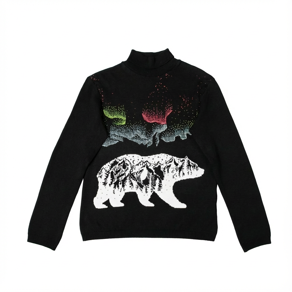 Эффектный вязаный свитер с северным характером: на чёрном фоне силуэт медведя с зимним лесным пейзажем внутри и яркое полярное сияние над ним. Контрастный рисунок сразу притягивает взгляд и делает свитер не просто тёплой вещью, а настоящим сувениром-впечатлением о Карелии и Севере. Смесовая пряжа с хлопком приятна к телу, а акрил помогает свитеру держать форму и быть более износостойким. Отлично подходит для зимних прогулок, поездок и в подарок — стильный, практичный и запоминающийся.