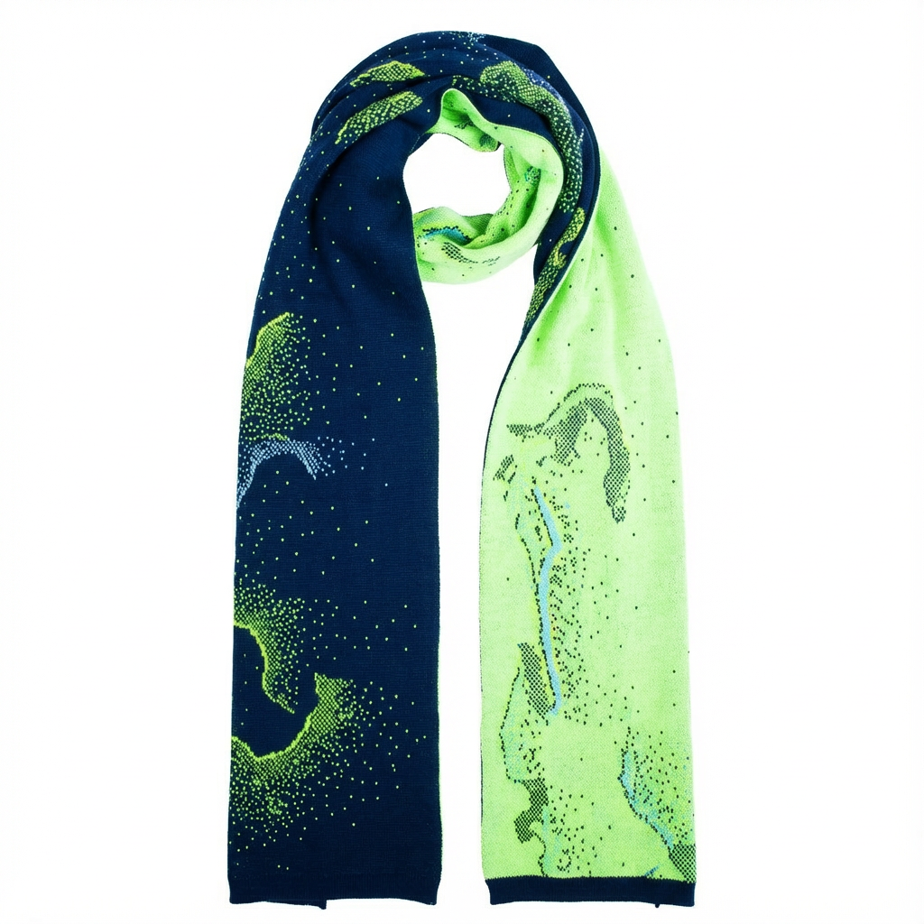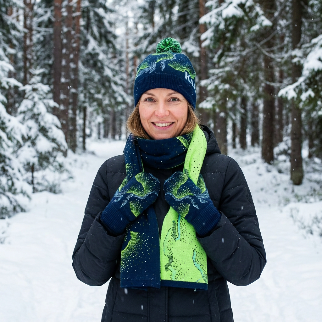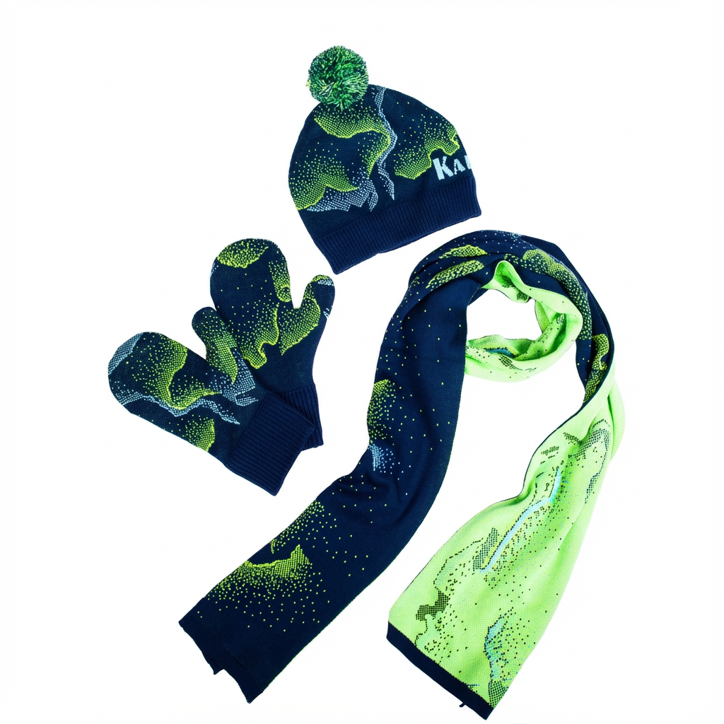 Яркий сувенирный вязаный комплект, вдохновлённый северным небом Карелии: глубокий тёмно‑синий фон и неоново‑зелёный узор, как настоящее полярное сияние над лесом. В набор входят шапка с помпоном, шарф и варежки — всё в едином дизайне, чтобы образ выглядел цельно и эффектно. Плотная вязка и широкие манжеты/резинки помогают удерживать тепло и защищают от ветра, поэтому комплект отлично подходит для зимних прогулок, поездок и подарков. Практичный и запоминающийся сувенир: красиво смотрится на фото и действительно носится каждый день.